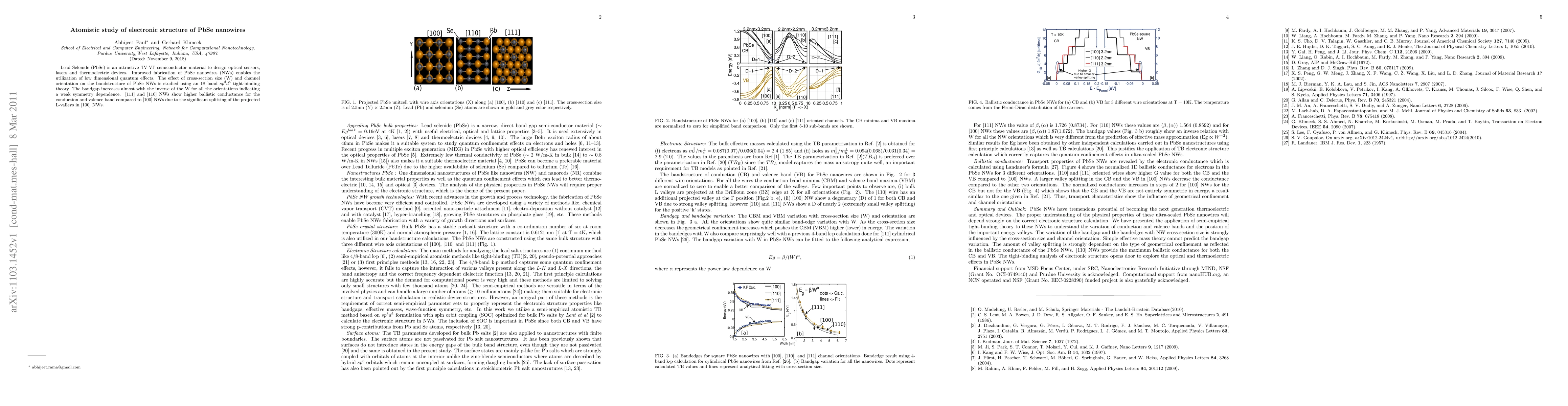 This study investigates the electronic structure of PbSe nanowires using tight-binding theory, finding that the bandgap increases inversely with the cross-section size, with minimal symmetry dependence. [111] and [110] oriented nanowires exhibit higher conductance than [100] due to valley splitting effects.