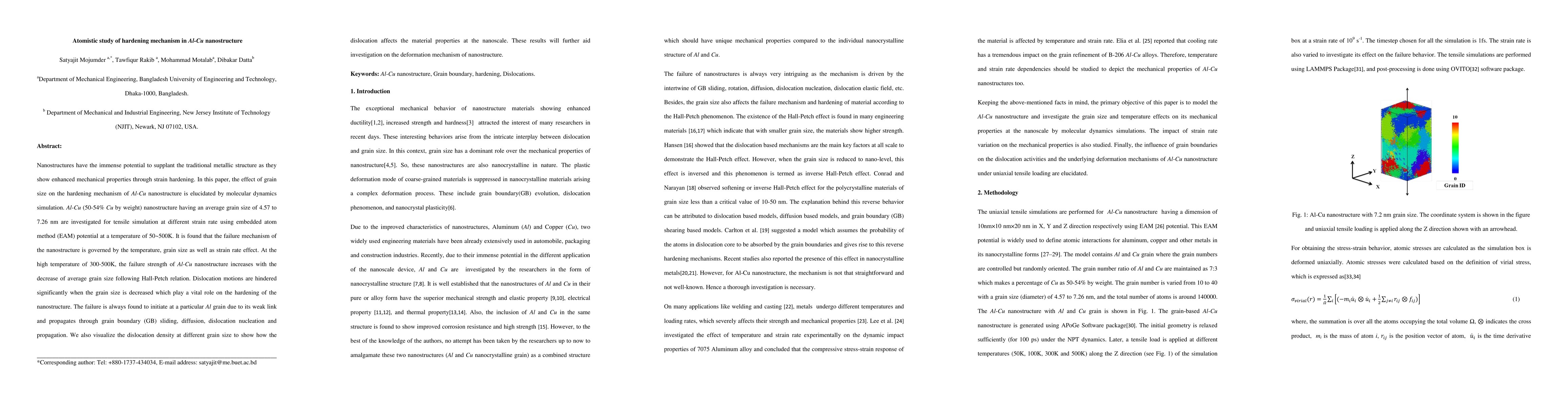 Nanostructures have the immense potential to supplant the traditional metallic structure as they show enhanced mechanical properties through strain hardening. In this paper, the effect of grain size on the hardening mechanism of Al-Cu nanostructure is elucidated by molecular dynamics simulation. Al-Cu (50-54% Cu by weight) nanostructure having an average grain size of 4.57 to 7.26 nm are investigated for tensile simulation at different strain rate using embedded atom method (EAM) potential at a temperature of 50~500K. It is found that the failure mechanism of the nanostructure is governed by the temperature, grain size as well as strain rate effect. At the high temperature of 300-500K, the failure strength of Al-Cu nanostructure increases with the decrease of average grain size following Hall-Petch relation. Dislocation motions are hindered significantly when the grain size is decreased which play a vital role on the hardening of the nanostructure. The failure is always found to initiate at a particular Al grain due to its weak link and propagates through grain boundary (GB) sliding, diffusion, dislocation nucleation and propagation. We also visualize the dislocation density at different grain size to show how the dislocation affects the material properties at the nanoscale. These results will further aid investigation on the deformation mechanism of nanostructure.