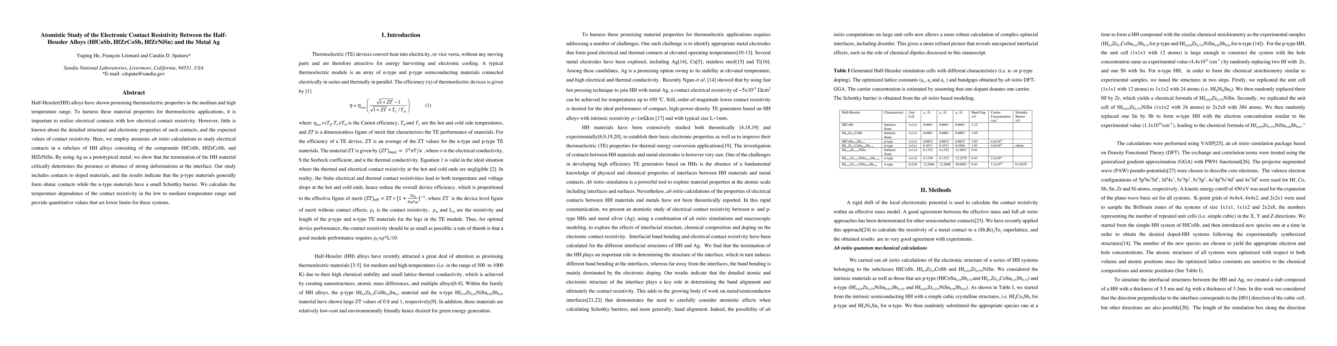 Researchers used atomistic ab initio calculations to study electrical contacts in Half-Heusler alloys with Silver, finding that contact resistivity is determined by the alloy's termination and forming ohmic or Schottky barriers.