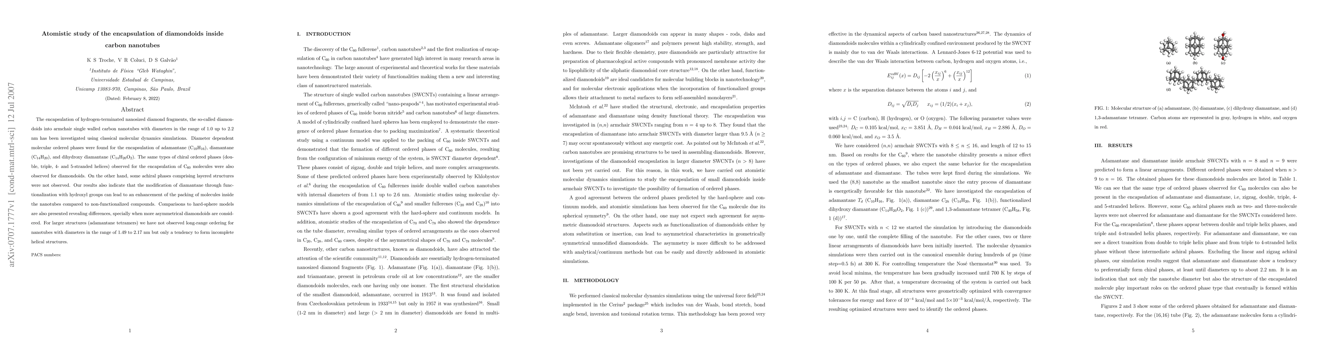 This study investigates the encapsulation of diamondoids within armchair single-walled carbon nanotubes using molecular dynamics simulations, revealing diameter-dependent ordered phases and helical structures similar to those seen in C60 encapsulation. Functionalization with hydroxyl groups enhances packing efficiency.