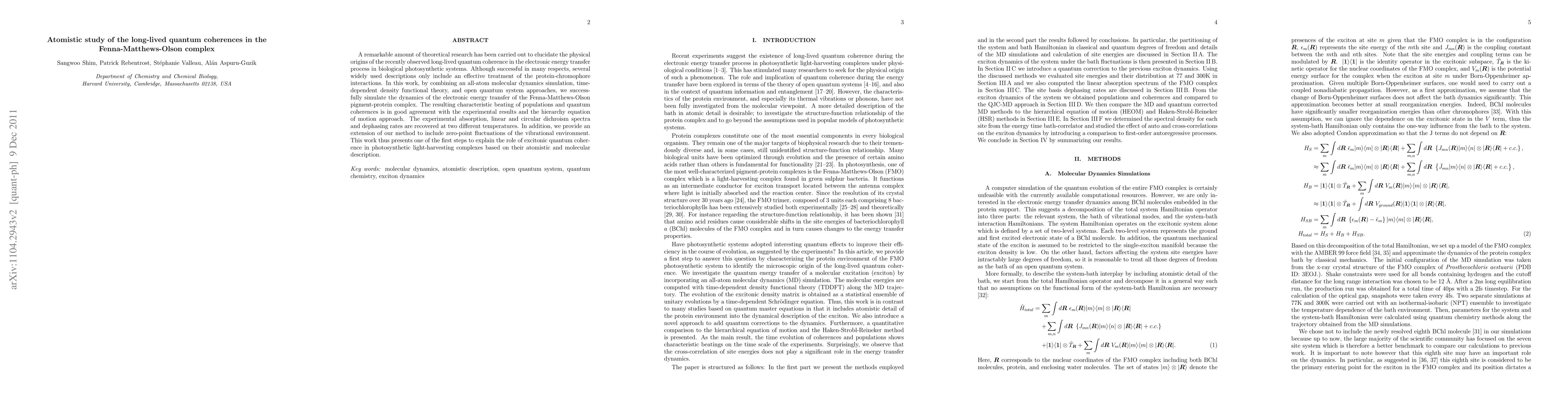 This paper combines molecular dynamics, time-dependent density functional theory, and quantum system approaches to simulate electronic energy transfer in the Fenna-Matthews-Olson complex, showing long-lived quantum coherences that match experimental results. The study extends to include zero-point fluctuations, providing a detailed atomistic explanation of excitonic quantum coherence in photosynthetic complexes.