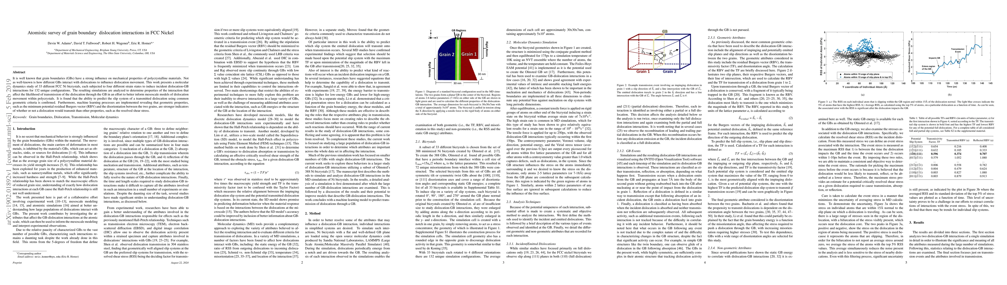This study uses molecular dynamics simulations on 33 bicrystals of FCC Nickel under four strain states to analyze dislocation-grain boundary interactions. It confirms that geometric criteria can predict transmitted dislocation slip systems and reveals that machine learning models, considering properties like minimum potential residual Burgers vector and grain disorientation, more accurately predict dislocation transmission than resolved shear stress.