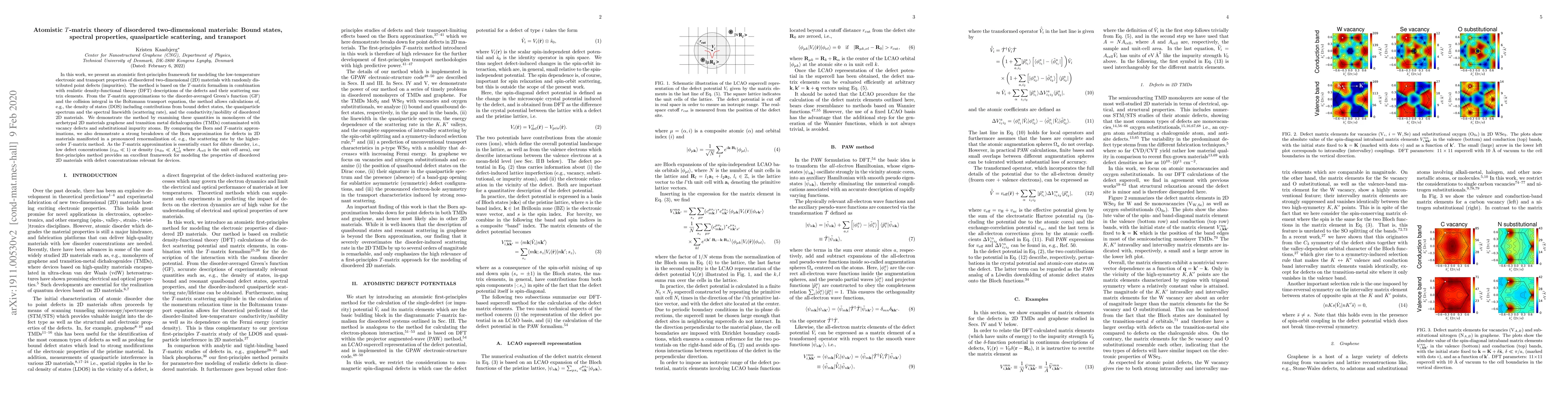 This paper introduces an atomistic first-principles framework based on the $T$-matrix theory for modeling electronic and transport properties in disordered 2D materials, including bound states and quasiparticle scattering. The method, combining $T$-matrix formalism with DFT, accurately calculates properties like density of states, spectral linewidth, and conductivity, demonstrating significant improvements over the Born approximation for defect-induced scattering.