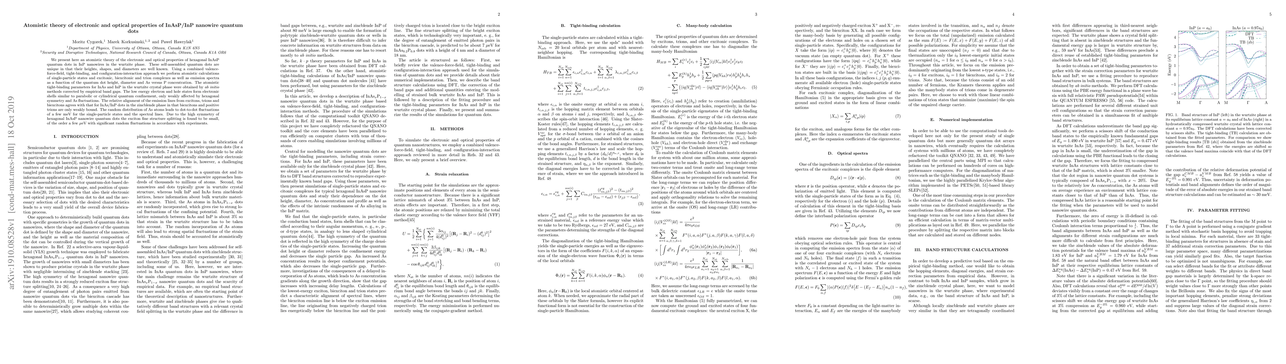 This paper develops an atomistic theory to analyze the electronic and optical properties of InAsP quantum dots in InP nanowires, finding that their electronic shells and emission spectra resemble those of InAs/InP dots in the zincblende phase despite hexagonal symmetry. The study reveals small exciton fine structure splittings and dot-to-dot fluctuations due to the random distribution of As atoms.