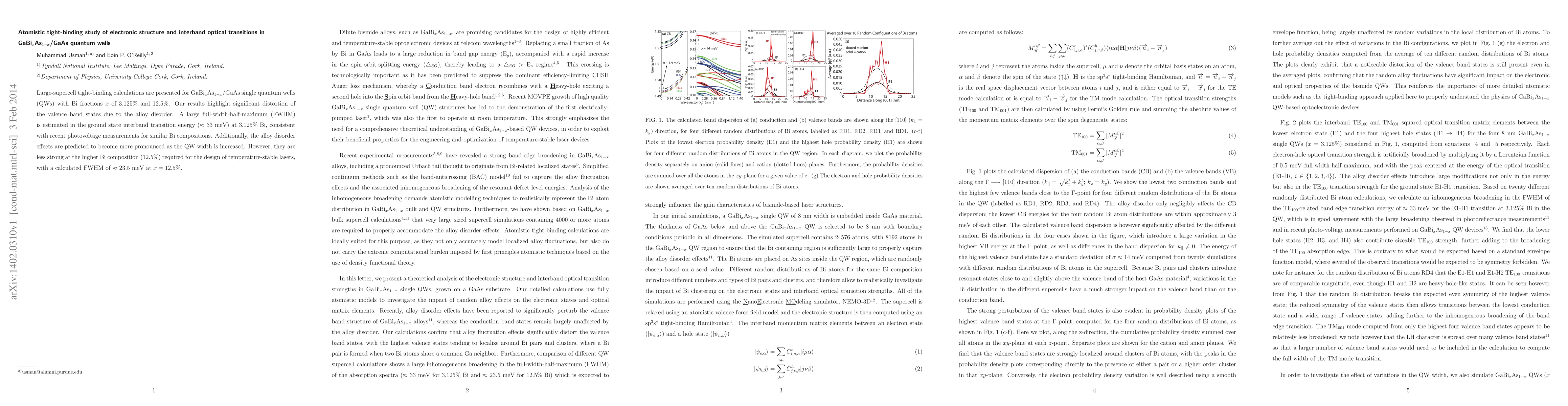 This paper uses large-supercell tight-binding calculations to study the electronic structure and optical transitions in GaBi$_{x}$As$_{1-x}$/GaAs quantum wells, revealing significant valence band distortion due to alloy disorder, with a larger effect at lower Bi fractions. The FWHM of interband transition energy is notably larger at 3.125% Bi compared to 12.5%, indicating reduced disorder effects at higher Bi compositions.