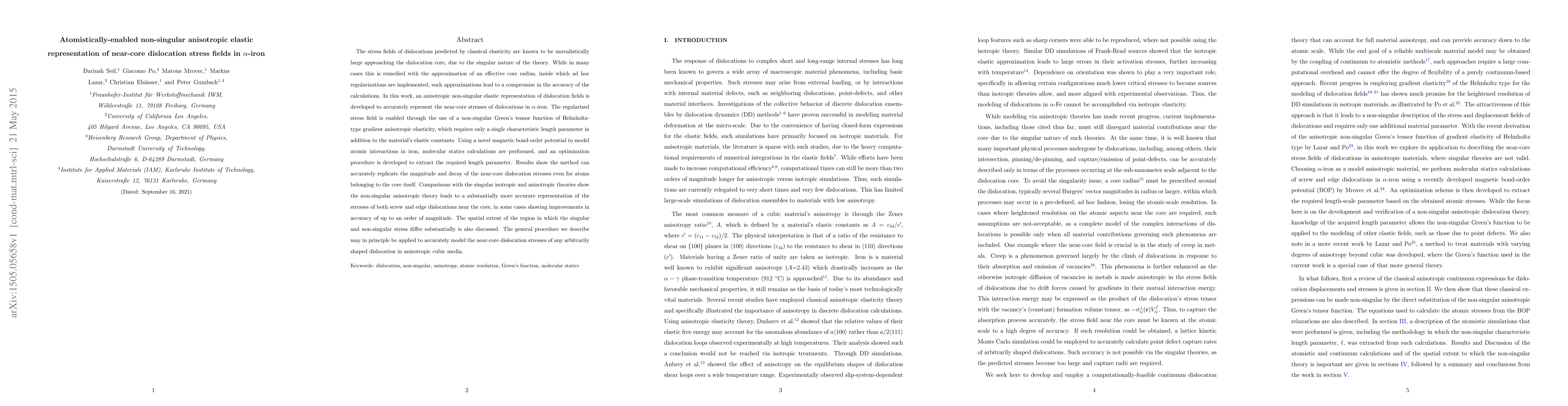 This paper develops a non-singular anisotropic elastic representation to accurately model near-core dislocation stress fields in $\alpha$-iron, using a novel Helmholtz-type gradient anisotropic elasticity approach. The method shows significant improvements in accuracy over classical singular elasticity models, especially for dislocations near the core.