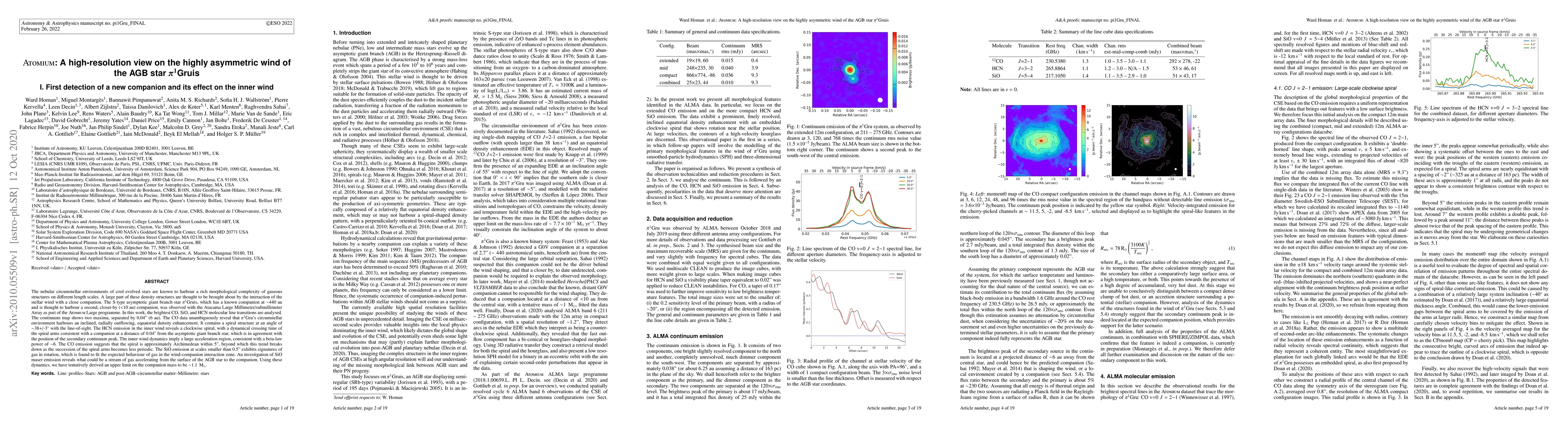 The nebular circumstellar environments of cool evolved stars are known to harbour a rich morphological complexity of gaseous structures on different length scales. A large part of these density structures are thought to be brought about by the interaction of the stellar wind with a close companion. The S-type asymptotic giant branch star Pi1 Gruis, which has a known companion at ~440 au and is thought to harbour a second, closer-by (<10 au) companion, was observed with the Atacama Large Millimeter/submillimeter Array as part of the ATOMIUM Large programme. In this work, the brightest CO, SiO, and HCN molecular line transitions are analysed. The continuum map shows two maxima, separated by 0.04'' (6 au). The CO data unambiguously reveal that Pi1 Gru's circumstellar environment harbours an inclined, radially outflowing, equatorial density enhancement. It contains a spiral structure at an angle of 38+/-3 deg with the line-of-sight. The HCN emission in the inner wind reveals a clockwise spiral, with a dynamical crossing time of the spiral arms consistent with a companion at a distance of 0.04'' from the asymptotic giant branch star, which is in agreement with the position of the secondary continuum peak. The inner wind dynamics imply a large acceleration region, consistent with a beta-law power of ~6. The CO emission suggests that the spiral is approximately Archimedean within 5'', beyond which this trend breaks down as the succession of the spiral arms becomes less periodic. The SiO emission at scales smaller than 0.5'' exhibits signatures of gas in rotation, which is found to fit the expected behaviour of gas in the wind-companion interaction zone. An investigation of SiO maser emission reveals what could be a stream of gas accelerating from the surface of the AGB star to the companion. Using these dynamics, we have tentatively derived an upper limit on the companion mass to be ~1.1 Msol.