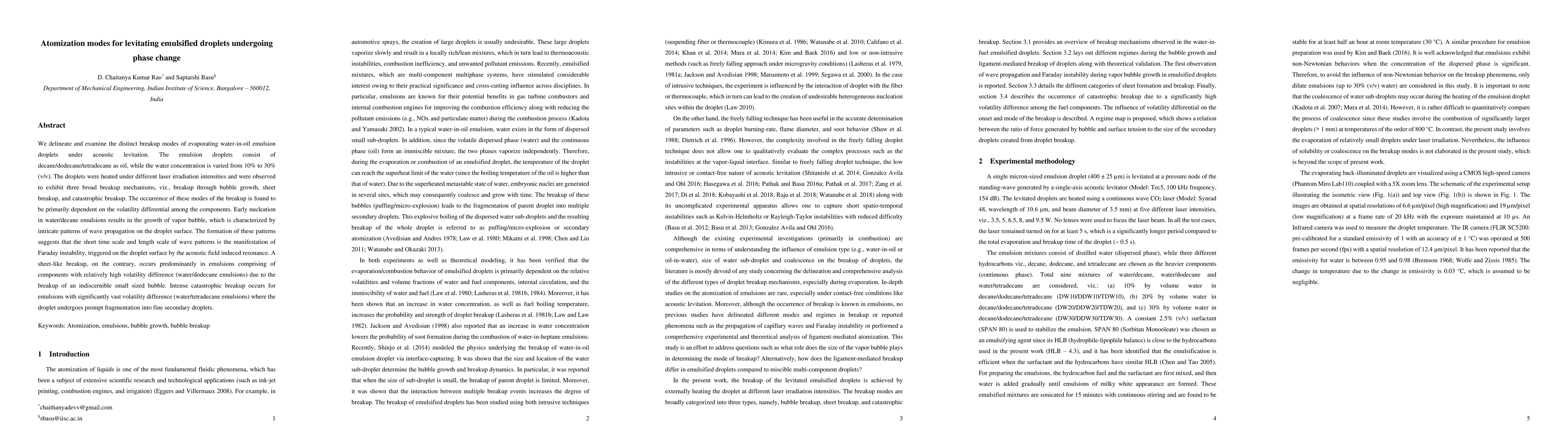 We delineate and examine the distinct breakup modes of evaporating water-in-oil emulsion droplets under acoustic levitation. The emulsion droplets consist of decane/dodecane/tetradecane as oil, while the water concentration is varied from 10% to 30% (v/v). The droplets were heated under different laser irradiation intensities and were observed to exhibit three broad breakup mechanisms, viz., breakup through bubble growth, sheet breakup, and catastrophic breakup. The occurrence of these modes of the breakup is found to be primarily dependent on the volatility differential among the components. Early nucleation in water/decane emulsions results in the growth of vapor bubble, which is characterized by intricate patterns of wave propagation on the droplet surface. The formation of these patterns suggests that the short time scale and length scale of wave patterns is the manifestation of Faraday instability, triggered on the droplet surface by the acoustic field induced resonance. A sheet-like breakup, on the contrary, occurs predominantly in emulsions comprising of components with relatively high volatility difference (water/dodecane emulsions) due to the breakup of an indiscernible small sized bubble. Intense catastrophic breakup occurs for emulsions with significantly vast volatility difference (water/tetradecane emulsions) where the droplet undergoes prompt fragmentation into fine secondary droplets.