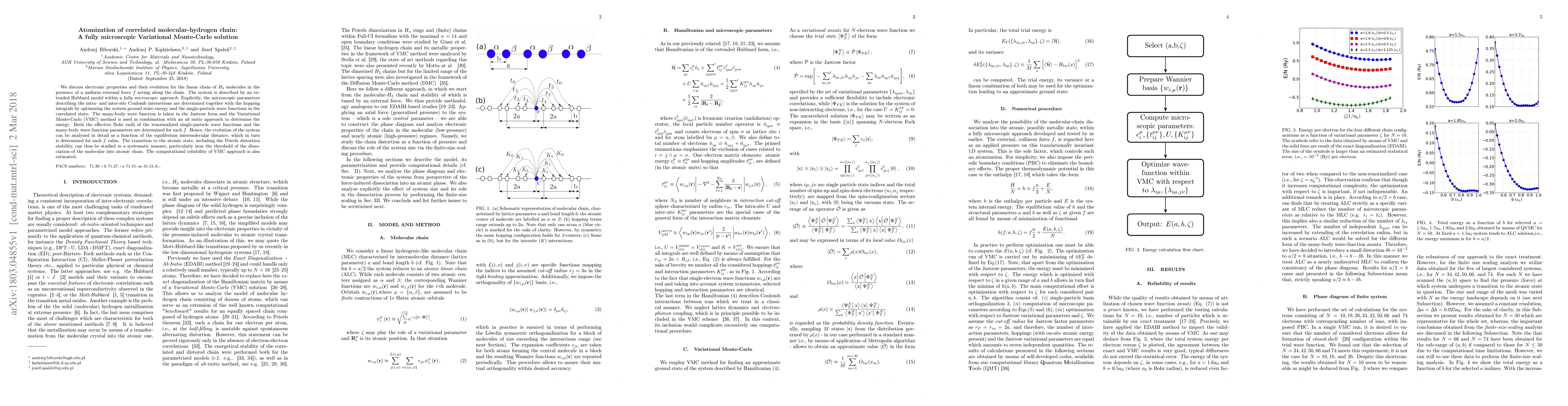 We discuss electronic properties and their evolution for the linear chain of $H_2$ molecules in the presence of a uniform external force $f$ acting along the chain. The system is described by an extended Hubbard model within a fully microscopic approach. Explicitly, the microscopic parameters describing the intra- and inter-site Coulomb interactions are determined together with the hopping integrals by optimizing the system ground state energy and the single-particle wave functions in the correlated state. The many-body wave function is taken in the Jastrow form and the Variational Monte-Carlo (VMC) method is used in combination with an ab initio approach to determine the energy. Both the effective Bohr radii of the renormalized single-particle wave functions and the many-body wave function parameters are determined for each $f$. Hence, the evolution of the system can be analyzed in detail as a function of the equilibrium intermolecular distance, which in turn is determined for each $f$ value. The transition to the atomic state, including the Peierls distortion stability, can thus be studied in a systematic manner, particularly near the threshold of the dissociation of the molecular into atomic chain. The computational reliability of VMC approach is also estimated.