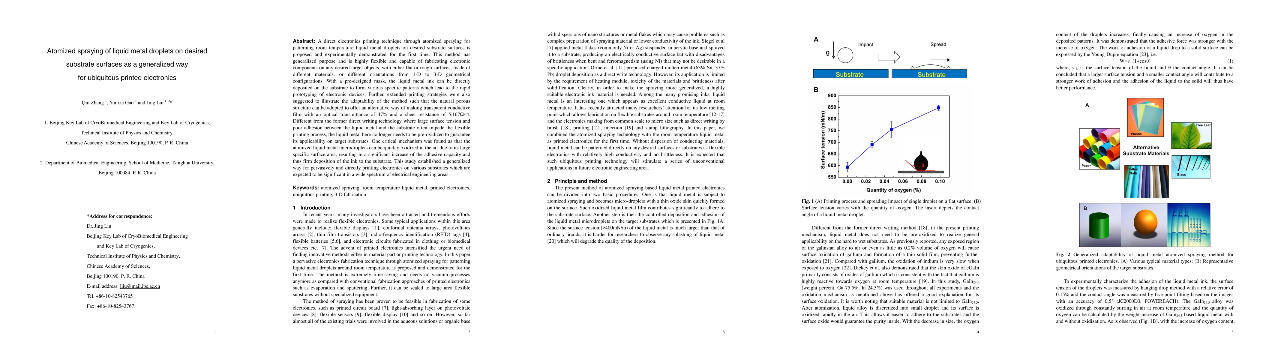 This paper proposes a novel atomized spraying technique for directly printing liquid metal droplets on diverse substrates, enabling flexible fabrication of electronic components on various surfaces and orientations. The method enhances adhesion through rapid oxidation of microdroplets, eliminating the need for pre-oxidation, and presents a new approach for creating transparent conductive films.