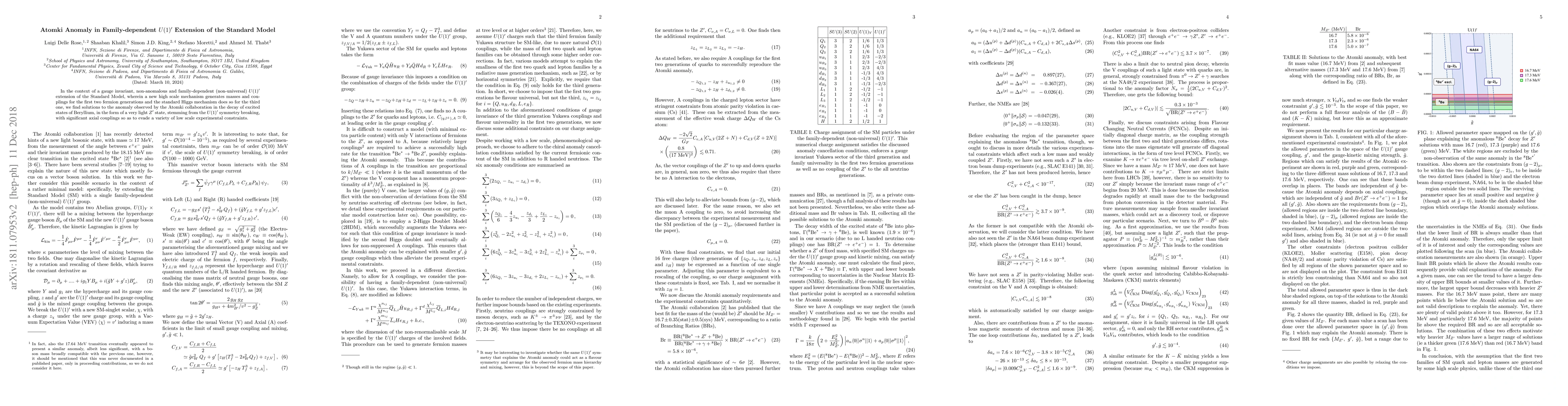 In the context of a gauge invariant, non-anomalous and family-dependent (non-universal) $U(1)'$ extension of the Standard Model, wherein a new high scale mechanism generates masses and couplings for the first two fermion generations and the standard Higgs mechanism does so for the third one, we find solutions to the anomaly observed by the Atomki collaboration in the decay of excited states of Beryllium, in the form of a very light $Z'$ state, stemming from the $U(1)'$ symmetry breaking, with significant axial couplings so as to evade a variety of low scale experimental constraints.