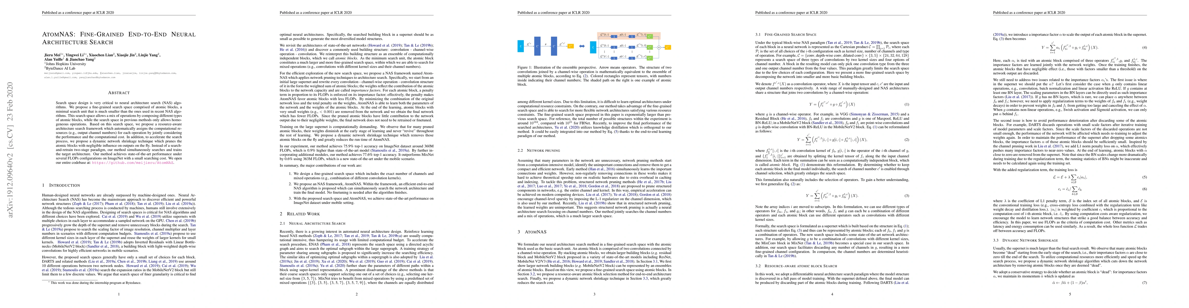 AtomNAS introduces a fine-grained search space using atomic blocks for neural architecture search, enabling mixed operations and resource-aware architecture optimization. It employs dynamic network shrinkage and simultaneous search-and-train to achieve state-of-the-art performance on ImageNet with reduced computational cost.