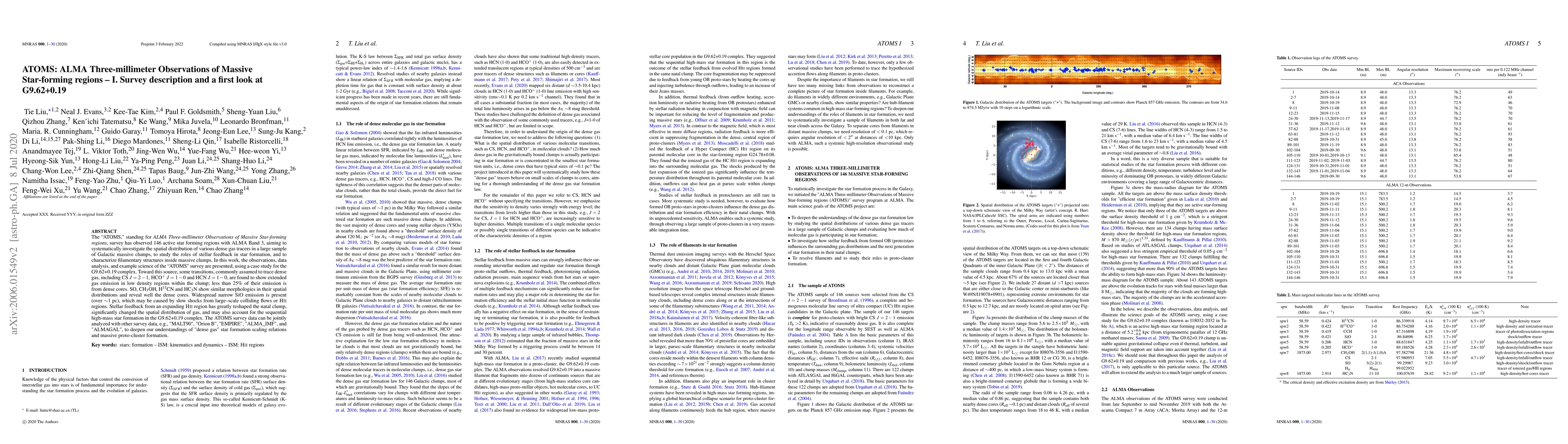 The "ATOMS," standing for {\it ALMA Three-millimeter Observations of Massive Star-forming regions}, survey has observed 146 active star forming regions with ALMA Band 3, aiming to systematically investigate the spatial distribution of various dense gas tracers in a large sample of Galactic massive clumps, to study the roles of stellar feedback in star formation, and to characterize filamentary structures inside massive clumps. In this work, the observations, data analysis, and example science of the "ATOMS" survey are presented, using a case study for the G9.62+0.19 complex. Toward this source, some transitions, commonly assumed to trace dense gas, including CS $J = 2-1$, HCO$^+$ $J = 1-0$ and HCN $J = 1-0$, are found to show extended gas emission in low density regions within the clump; less than 25\% of their emission is from dense cores. SO, CH$_3$OH, H$^{13}$CN and HC$_3$N show similar morphologies in their spatial distributions and reveal well the dense cores. Widespread narrow SiO emission is present (over $\sim$1 pc), which may be caused by slow shocks from large--scale colliding flows or H{\sc ii} regions. Stellar feedback from an expanding H{\sc ii} region has greatly reshaped the natal clump, significantly changed the spatial distribution of gas, and may also account for the sequential high-mass star formation in the G9.62+0.19 complex. The ATOMS survey data can be jointly analyzed with other survey data, e.g., "MALT90", "Orion B", "EMPIRE", "ALMA\_IMF", and "ALMAGAL", to deepen our understandings of "dense gas" star formation scaling relations and massive proto-cluster formation.