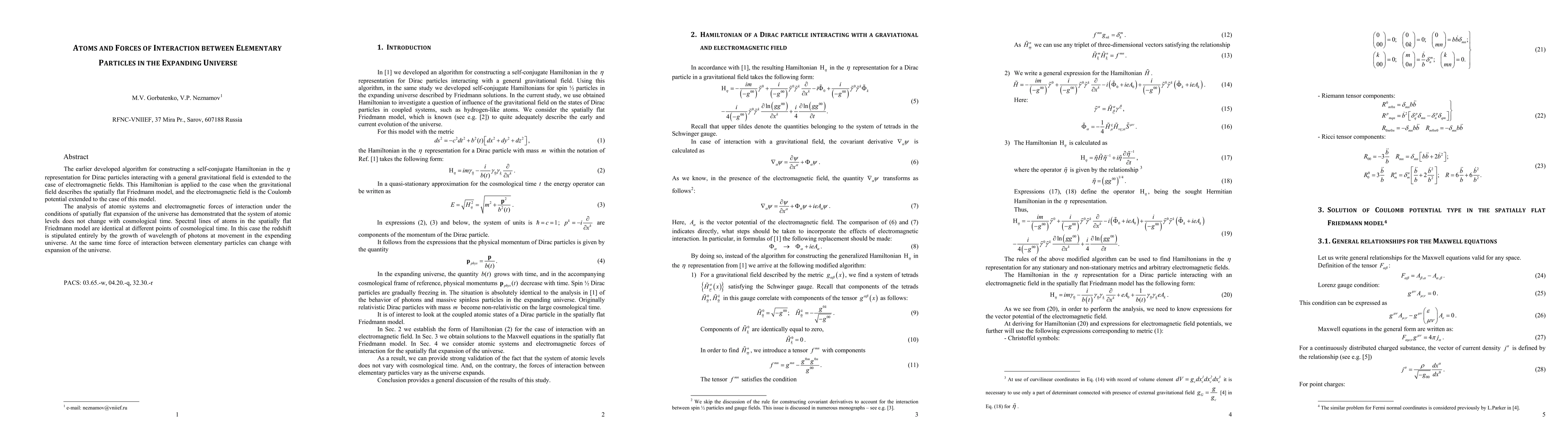 This paper extends an algorithm for constructing a self-conjugate Hamiltonian for Dirac particles in gravitational and electromagnetic fields, applying it to a spatially flat Friedmann model. The study finds that atomic levels remain constant over cosmological time, while the redshift of spectral lines is due to photon wavelength growth in the expanding universe, and forces between elementary particles can vary with cosmic expansion.