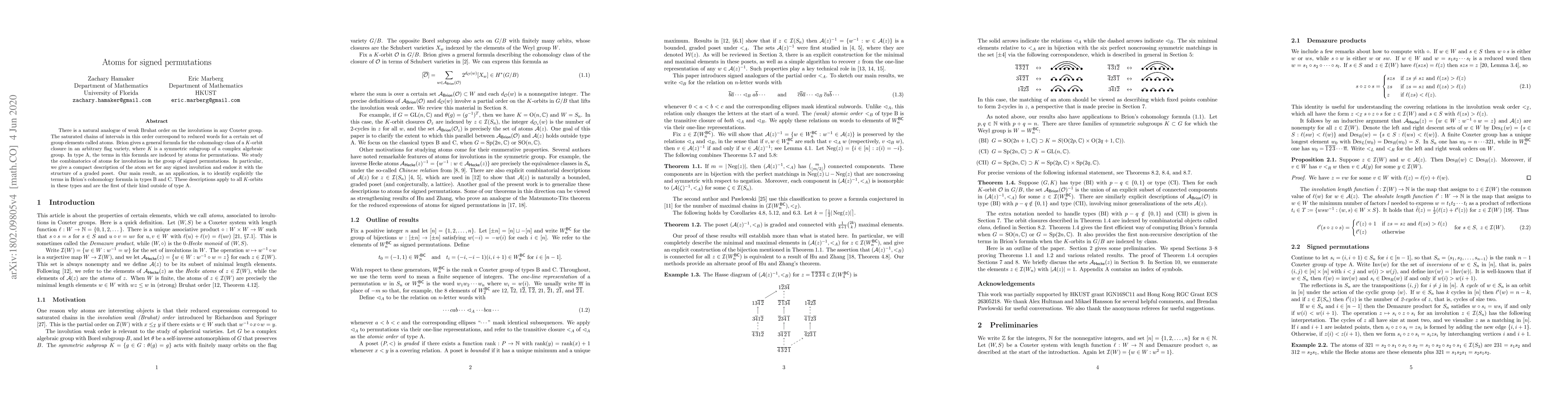 There is a natural analogue of weak Bruhat order on the involutions in any Coxeter group. The saturated chains of intervals in this order correspond to reduced words for a certain set of group elements called atoms. Brion gives a general formula for the cohomology class of a $K$-orbit closure in an arbitrary flag variety, where $K$ is a symmetric subgroup of a complex algebraic group. In type A, the terms in this formula are indexed by atoms for permutations. We study the combinatorics of atoms for involutions in the group of signed permutations. In particular, we give a compact description of the atom set for any signed involution and endow it with the structure of a graded poset. Our main result, as an application, is to identify explicitly the terms in Brion's cohomology formula in types B and C. These descriptions apply to all $K$-orbits in these types and are the first of their kind outside of type A.