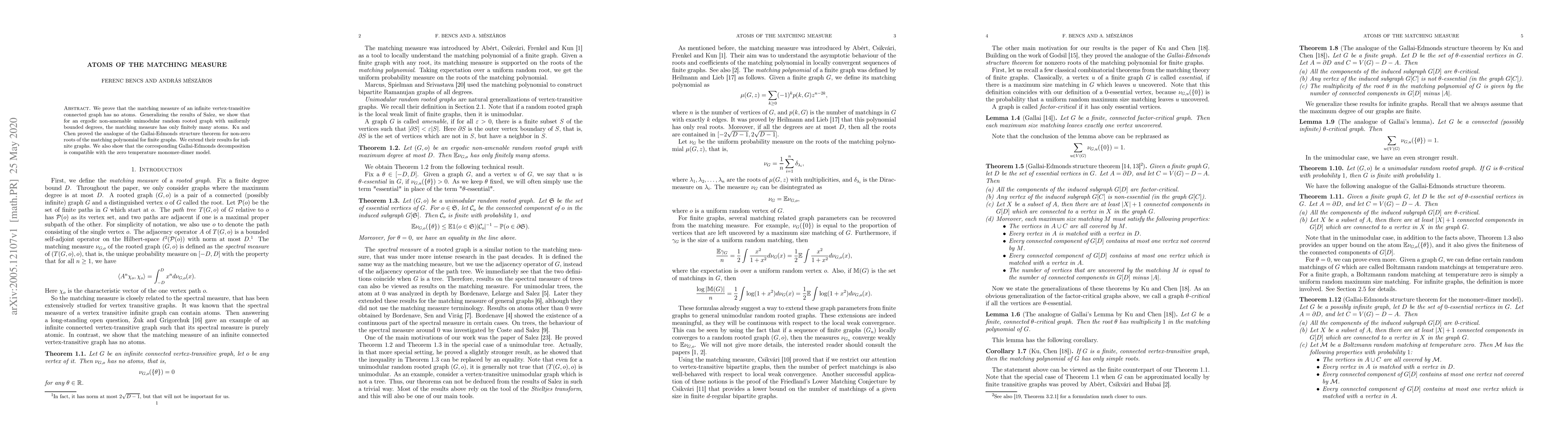 We prove that the matching measure of an infinite vertex-transitive connected graph has no atoms. Generalizing the results of Salez, we show that for an ergodic non-amenable unimodular random rooted graph with uniformly bounded degrees, the matching measure has only finitely many atoms. Ku and Chen proved the analogue of the Gallai-Edmonds structure theorem for non-zero roots of the matching polynomial for finite graphs. We extend their results for infinite graphs. We also show that the corresponding Gallai-Edmonds decomposition is compatible with the zero temperature monomer-dimer model.