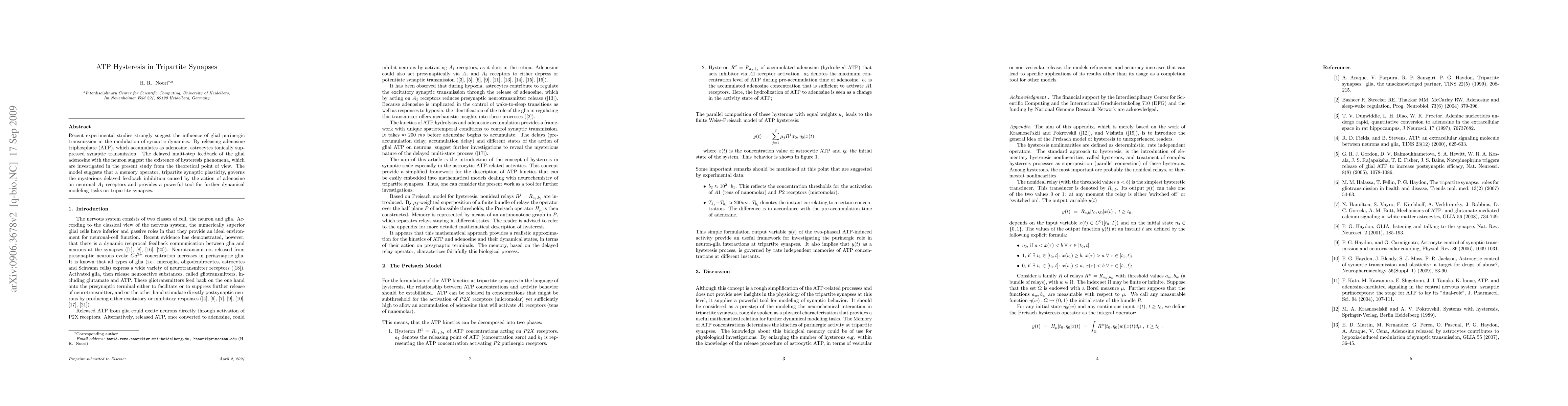 This study investigates the theoretical underpinnings of ATP hysteresis in tripartite synapses, proposing that glial purinergic transmission modulates synaptic dynamics through a delayed feedback mechanism involving adenosine. The model suggests that tripartite synaptic plasticity acts as a memory operator, explaining the delayed inhibition caused by adenosine on neuronal A1 receptors.
