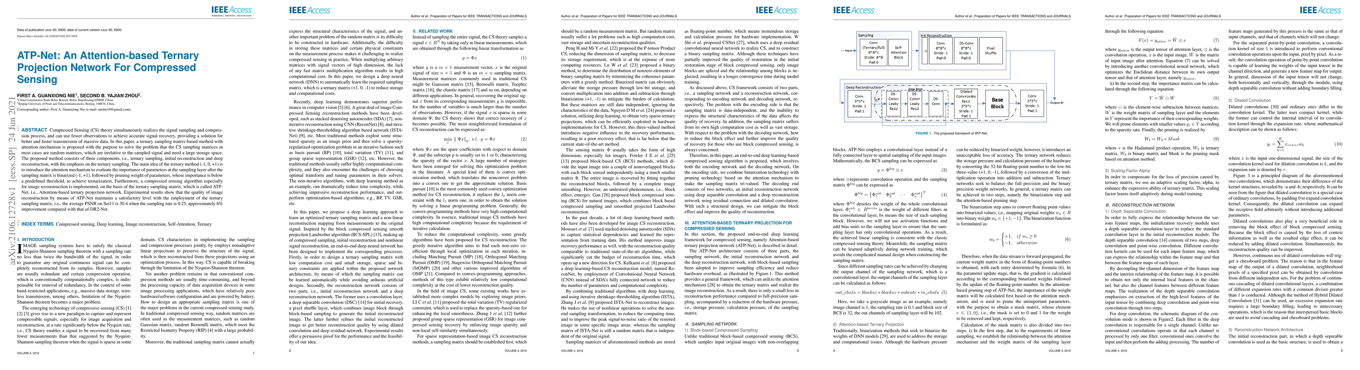This paper proposes ATP-Net, an attention-based ternary projection network for compressed sensing, utilizing a ternary sampling matrix to reduce storage space and improve signal recovery efficiency. Experimental results show ATP-Net achieves satisfactory image reconstruction quality, with a 6% improvement in average PSNR compared to DR2-Net.