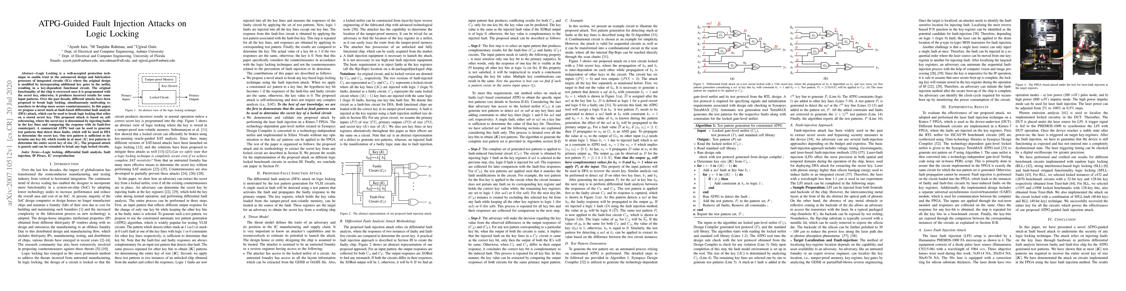 This paper proposes a novel fault injection attack using ATPG-guided differential fault analysis to break logic locking in ICs. The attack leverages stuck-at faults to determine the secret key by comparing fault responses with the fault-free circuit, requiring only |K| test patterns to uncover the entire key.