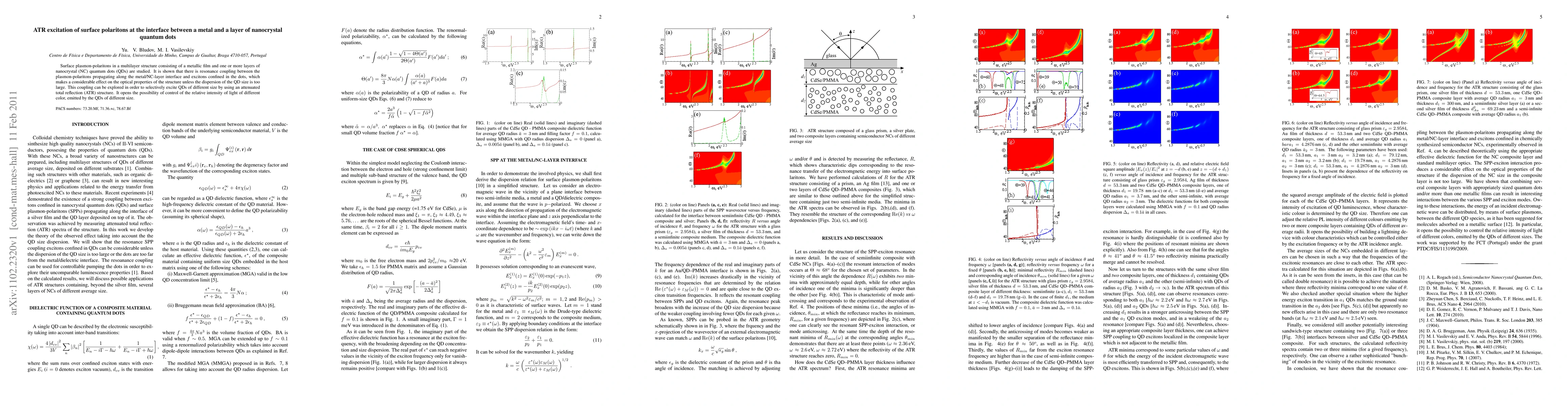 Surface plasmon-polaritons in a multilayer structure consisting of a metallic film and one or more layers of nanocrystal (NC) quantum dots (QDs) are studied. It is shown that there is resonance coupling between the plasmon-polaritons propagating along the metal/NC-layer interface and excitons confined in the dots, which makes a considerable effect on the optical properties of the structure unless the dispersion of the QD size is too large. This coupling can be explored in order to selectively excite QDs of different size by using an attenuated total reflection (ATR) structure. It opens the possibility of control of the relative intensity of light of different color, emitted by the QDs of different size.