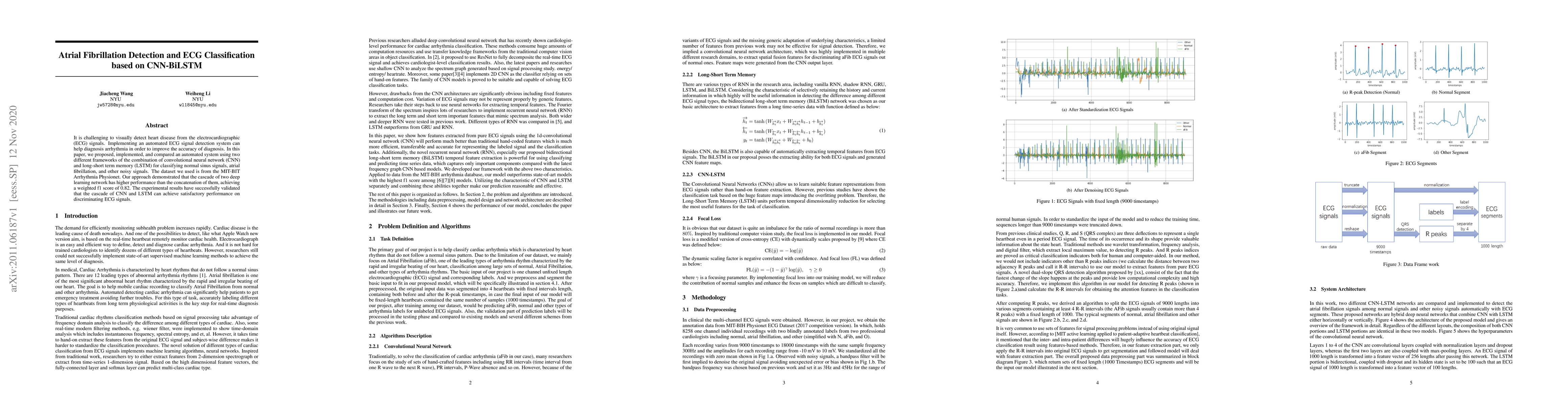 This paper proposes an automated ECG classification system using a combination of CNN and BiLSTM networks to detect atrial fibrillation and classify normal sinus and noisy signals. The cascaded CNN-BiLSTM model outperformed the concatenated version, achieving a weighted f1 score of 0.82 on the MIT-BIH dataset.