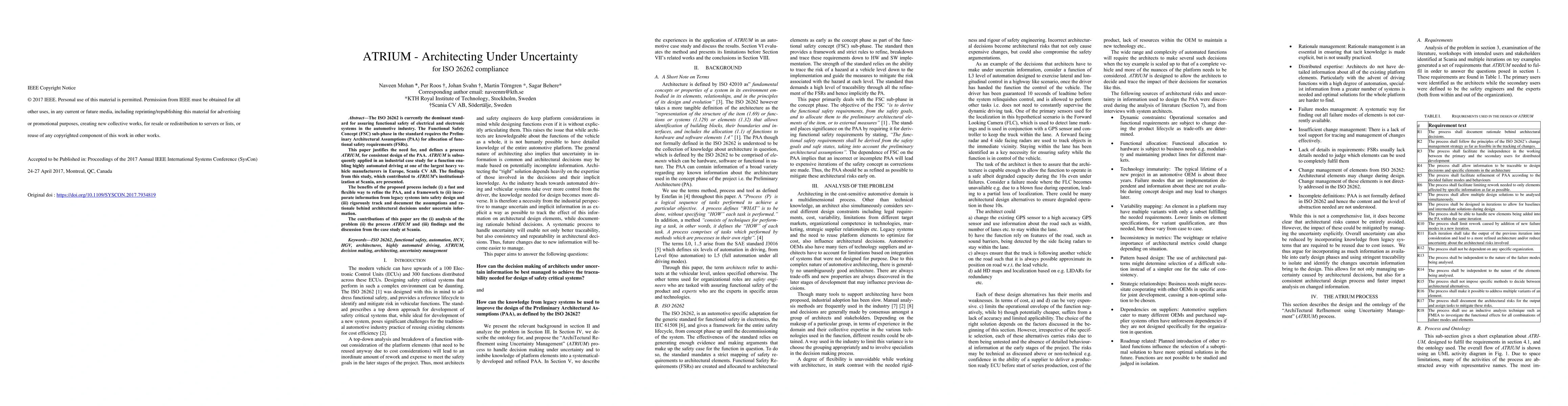 This paper introduces ATRIUM, a process for architecting under uncertainty to ensure ISO 26262 compliance in automotive functional safety. It applies ATRIUM in a case study at Scania CV AB, demonstrating benefits such as refining preliminary architectural assumptions and incorporating legacy system information into safety design.