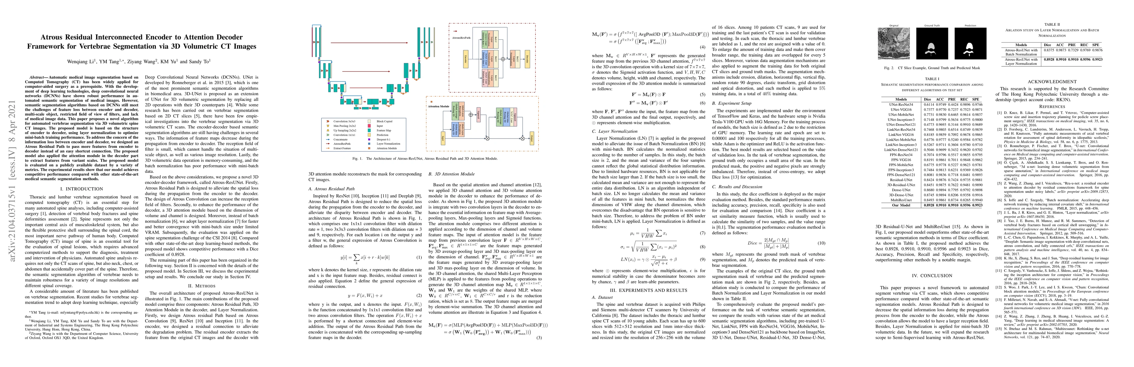 This paper proposes an Atrous Residual Interconnected Encoder to Attention Decoder framework for automated vertebrae segmentation in 3D volumetric CT images, addressing feature loss and multi-scale object challenges. Experimental results demonstrate competitive performance against other state-of-the-art methods.