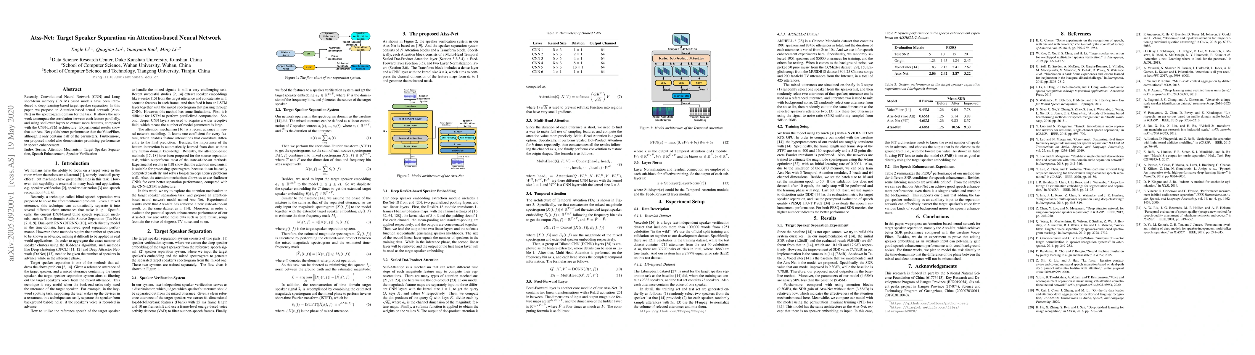 Atss-Net is an attention-based neural network for target speaker separation that outperforms VoiceFilter with fewer parameters. It leverages shallower layers and parallel feature correlation computation in the spectrogram domain, also showing potential in speech enhancement.