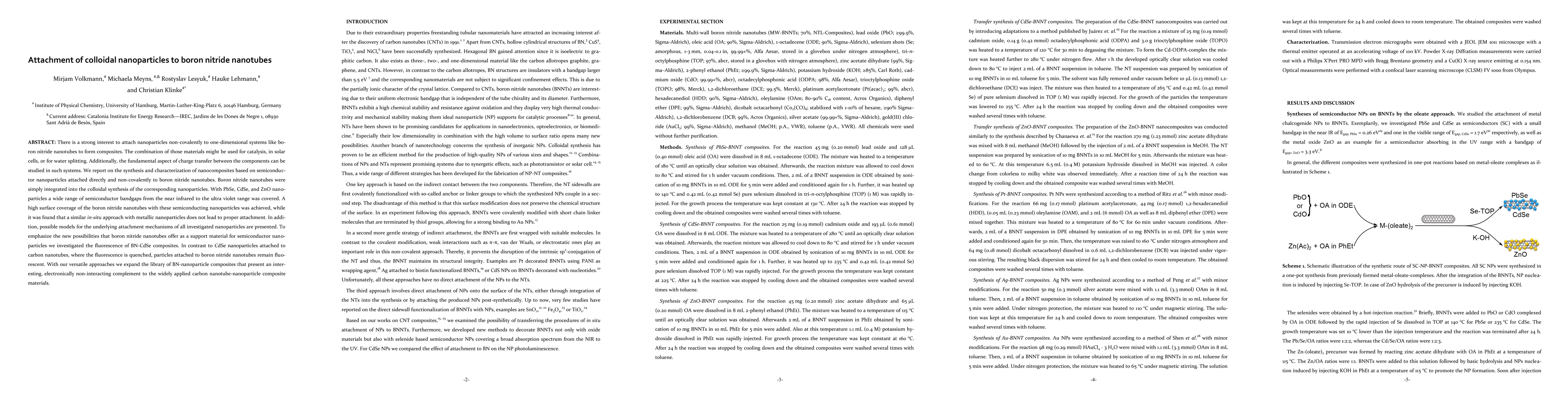 The paper describes a method for non-covalently attaching various semiconductor colloidal nanoparticles to boron nitride nanotubes, achieving high surface coverage and demonstrating preserved fluorescence in BN-CdSe composites. This approach broadens the range of BN-nanoparticle composites, offering an electronically non-interacting alternative to carbon nanotube-based composites.