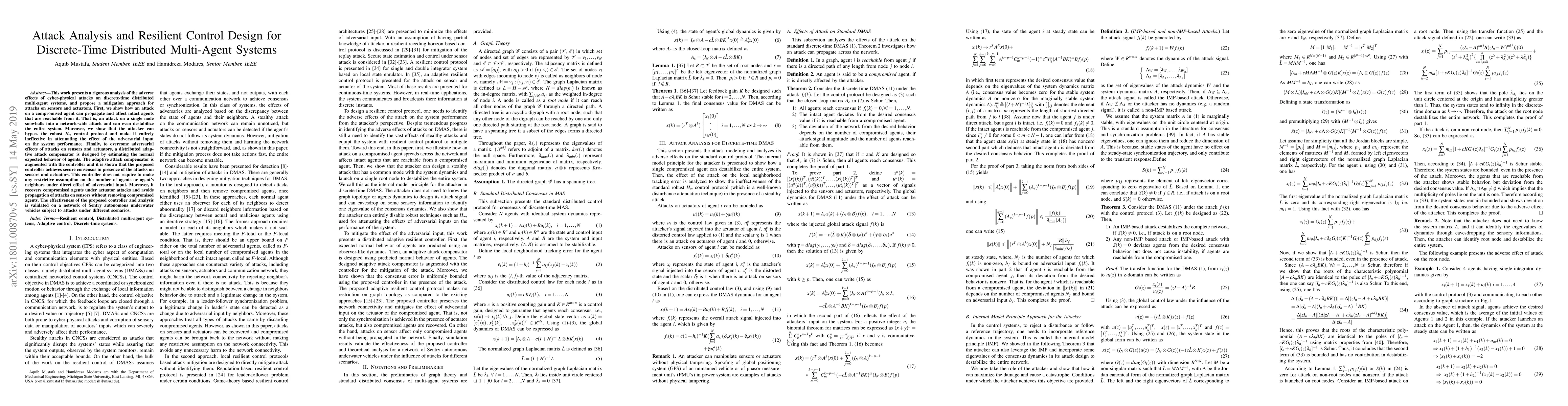 This work presents a rigorous analysis of the adverse effects of cyber-physical attacks on discrete-time distributed multi-agent systems, and propose a mitigation approach for attacks on sensors and actuators. First, we show how an attack on a compromised agent can propagate and affect intact agents that are reachable from it. This is, an attack on a single node snowballs into a network-wide attack and can even destabilize the entire system. Moreover, we show that the attacker can bypass the robust $H_{\infty}$ control protocol and make it entirely ineffective in attenuating the effect of the adversarial input on the system performance. Finally, to overcome adversarial effects of attacks on sensors and actuators, a distributed adaptive attack compensator is designed by estimating the normal expected behavior of agents. The adaptive attack compensator is augmented with the controller and it is shown that the proposed controller achieves secure consensus in presence of the attacks on sensors and actuators. This controller does not require to make any restrictive assumption on the number of agents or agent's neighbors under direct effect of adversarial input. Moreover, it recovers compromised agents under actuator attacks and avoids propagation of attacks on sensors without removing compromised agents. The effectiveness of the proposed controller and analysis is validated on a network of Sentry autonomous underwater vehicles subject to attacks under different scenarios.