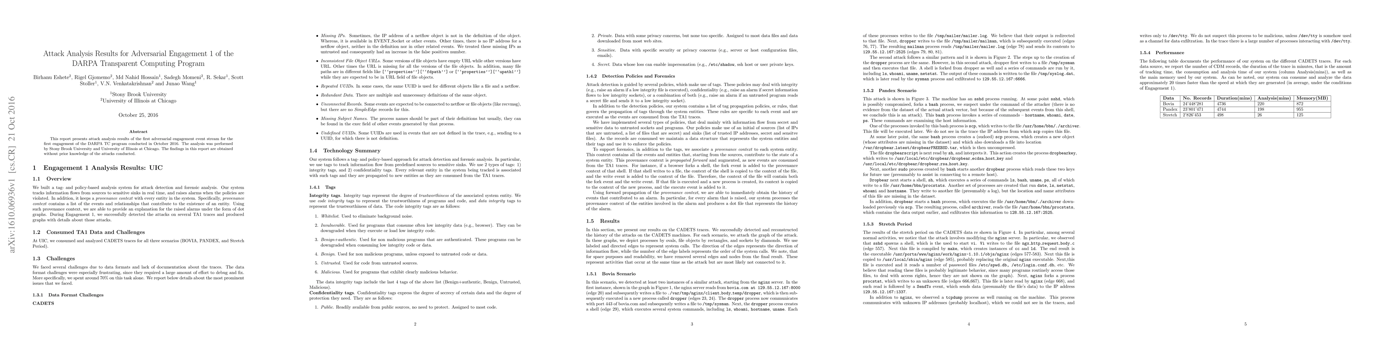 This report details the attack analysis results from the first adversarial engagement event in the DARPA Transparent Computing Program held in October 2016, conducted by Stony Brook University and the University of Illinois at Chicago, with findings derived without prior knowledge of the attacks.