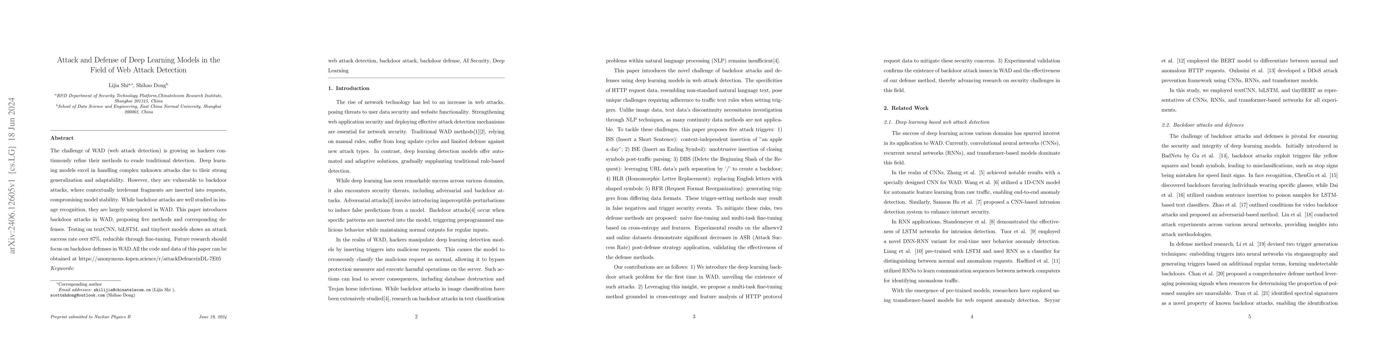 This paper explores backdoor attacks on deep learning models for web attack detection (WAD), proposing five new attack methods and corresponding defenses. It demonstrates high attack success rates on textCNN, biLSTM, and tinybert models, which can be mitigated through fine-tuning, highlighting the need for further research in WAD backdoor defenses.