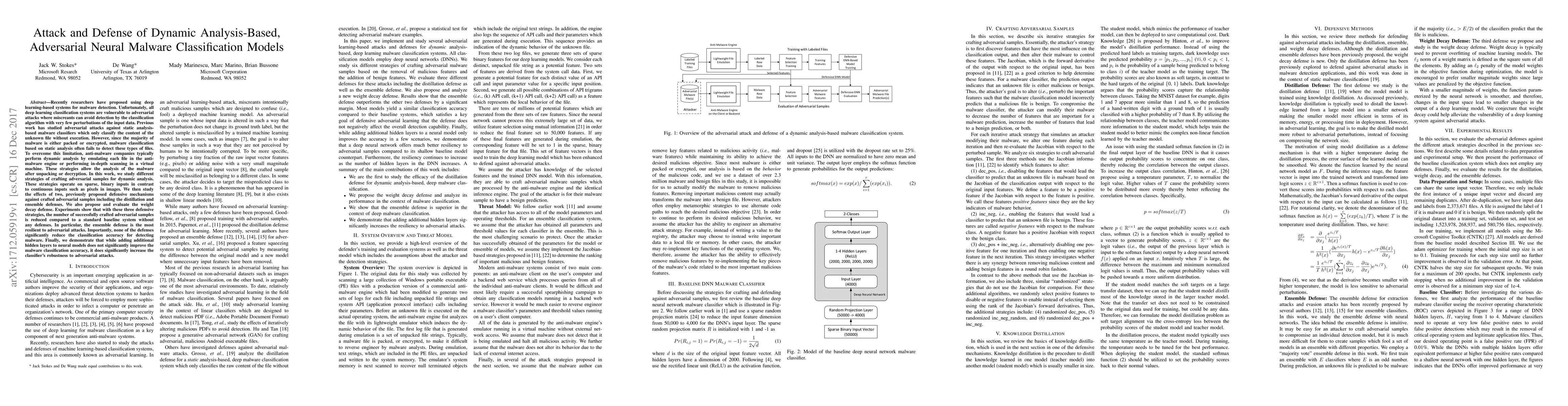 This paper investigates adversarial attacks on dynamic analysis-based neural malware classifiers and evaluates the effectiveness of three defense strategies: distillation, ensemble, and weight decay. The study finds that ensemble defenses are the most resilient, significantly reducing successful adversarial attacks without compromising malware detection accuracy.
