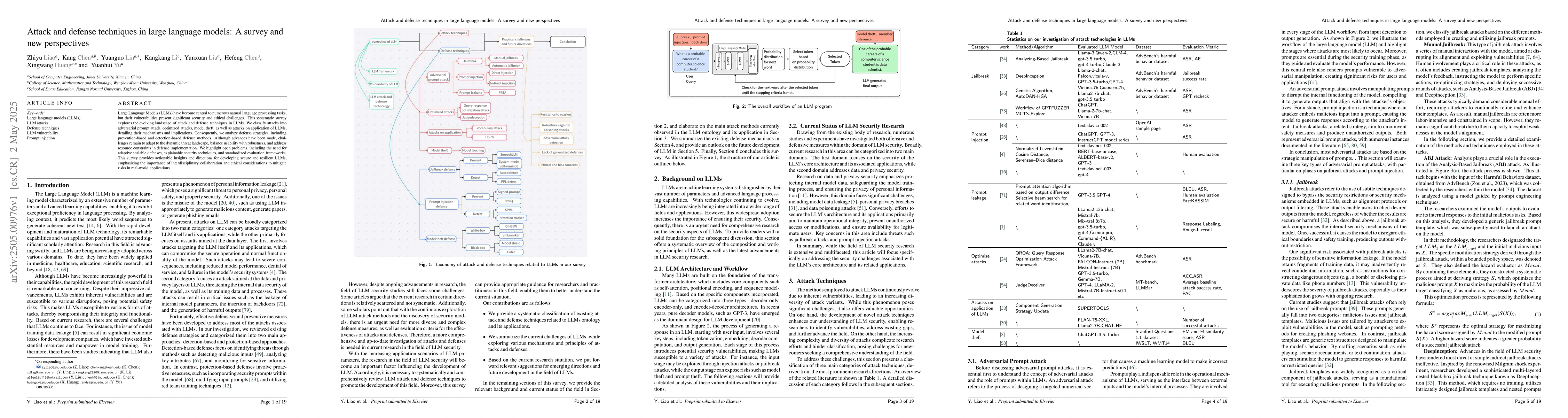 Large Language Models (LLMs) have become central to numerous natural language processing tasks, but their vulnerabilities present significant security and ethical challenges. This systematic survey explores the evolving landscape of attack and defense techniques in LLMs. We classify attacks into adversarial prompt attack, optimized attacks, model theft, as well as attacks on application of LLMs, detailing their mechanisms and implications. Consequently, we analyze defense strategies, including prevention-based and detection-based defense methods. Although advances have been made, challenges remain to adapt to the dynamic threat landscape, balance usability with robustness, and address resource constraints in defense implementation. We highlight open problems, including the need for adaptive scalable defenses, explainable security techniques, and standardized evaluation frameworks. This survey provides actionable insights and directions for developing secure and resilient LLMs, emphasizing the importance of interdisciplinary collaboration and ethical considerations to mitigate risks in real-world applications.