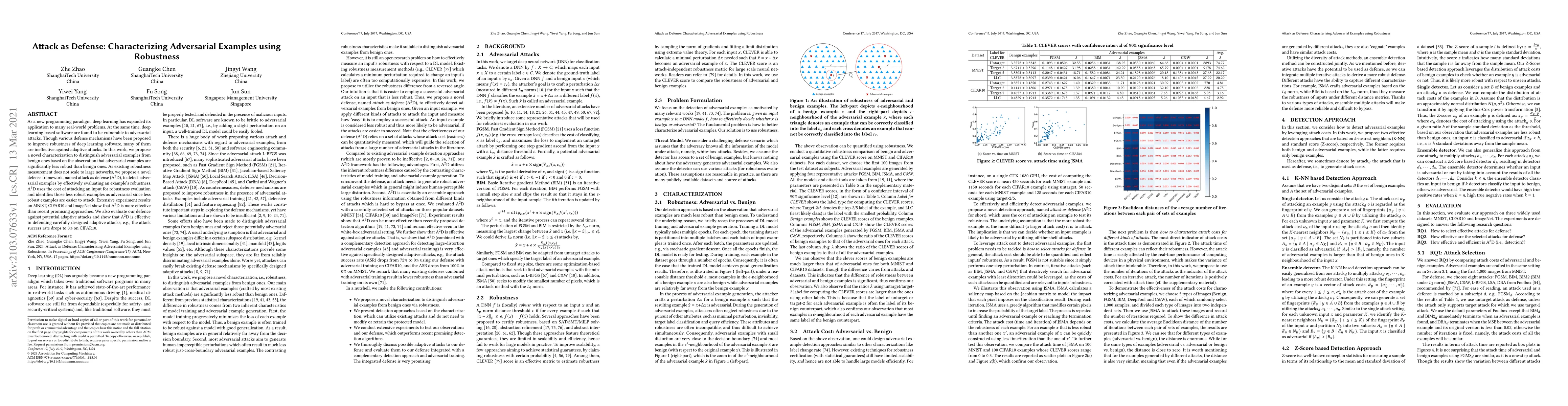As a new programming paradigm, deep learning has expanded its application to many real-world problems. At the same time, deep learning based software are found to be vulnerable to adversarial attacks. Though various defense mechanisms have been proposed to improve robustness of deep learning software, many of them are ineffective against adaptive attacks. In this work, we propose a novel characterization to distinguish adversarial examples from benign ones based on the observation that adversarial examples are significantly less robust than benign ones. As existing robustness measurement does not scale to large networks, we propose a novel defense framework, named attack as defense (A2D), to detect adversarial examples by effectively evaluating an example's robustness. A2D uses the cost of attacking an input for robustness evaluation and identifies those less robust examples as adversarial since less robust examples are easier to attack. Extensive experiment results on MNIST, CIFAR10 and ImageNet show that A2D is more effective than recent promising approaches. We also evaluate our defence against potential adaptive attacks and show that A2D is effective in defending carefully designed adaptive attacks, e.g., the attack success rate drops to 0% on CIFAR10.