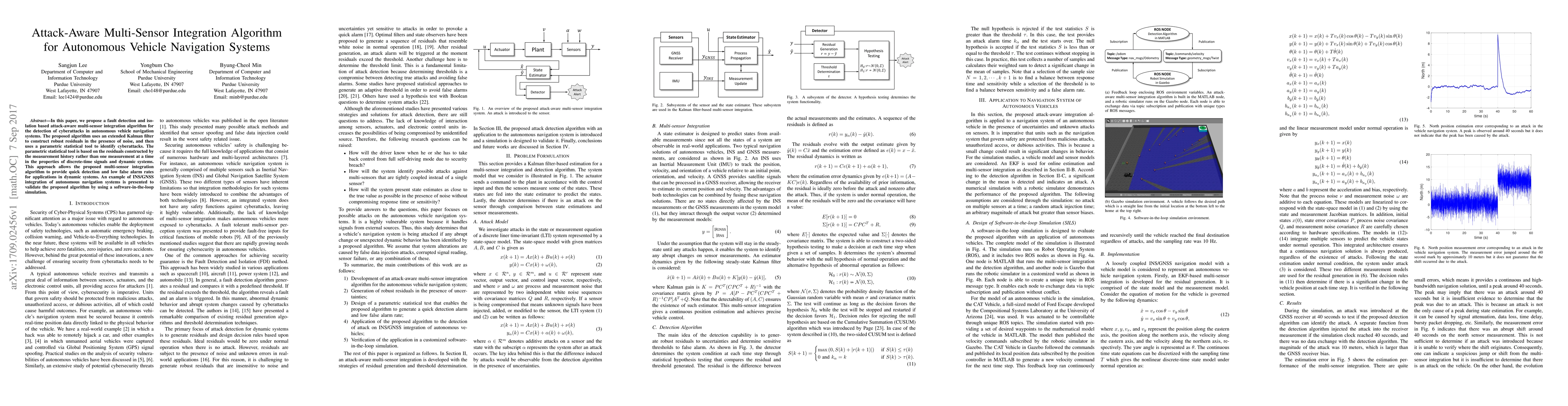 This paper introduces an attack-aware multi-sensor integration algorithm for autonomous vehicle navigation systems, employing an extended Kalman filter to detect cyberattacks through robust residual construction and a parametric statistical tool based on measurement history. The method demonstrates quick detection and low false alarm rates, validated via INS/GNSS integration simulation.