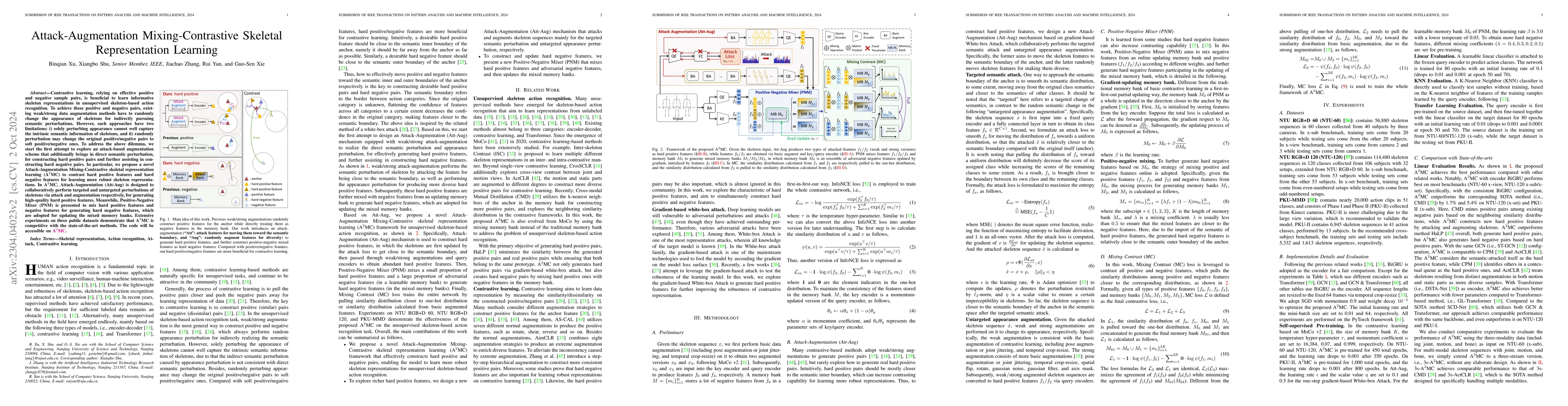 This paper proposes an Attack-Augmentation Mixing-Contrastive learning (A$^2$MC) method to enhance skeleton representation learning through direct semantic perturbations. It uses Attack-Augmentation (Att-Aug) to generate hard positive features and a Positive-Negative Mixer (PNM) to create hard negative features, achieving competitive performance on skeleton-based action recognition tasks.