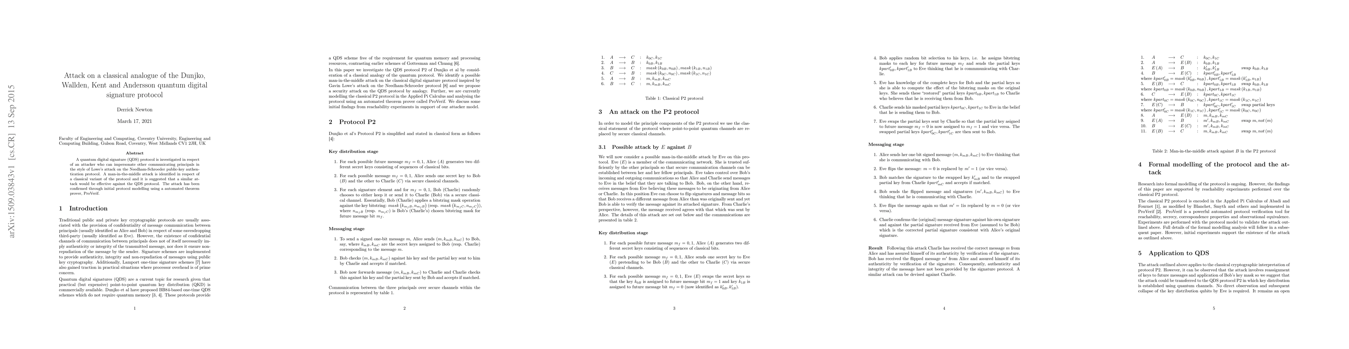 A quantum digital signature (QDS) protocol is investigated in respect of an attacker who can impersonate other communicating principals in the style of Lowe's attack on the Needham-Schroeder public-key authentication protocol. A man-in-the-middle attack is identified in respect of a classical variant of the protocol and it is suggested that a similar attack would be effective against the QDS protocol. The attack has been confirmed through initial protocol modelling using a automated theorem prover, ProVerif.