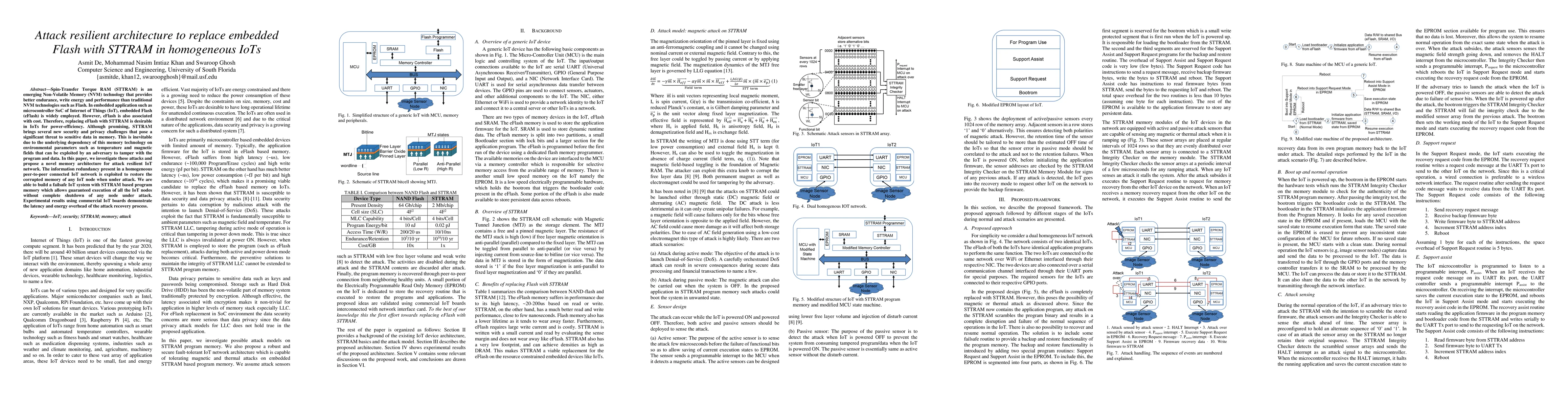 This paper proposes an attack resilient architecture to replace embedded Flash with STTRAM in homogeneous IoT networks, addressing security and privacy challenges posed by STTRAM's environmental sensitivity. The architecture leverages information redundancy in peer-to-peer IoT networks to restore corrupted memory, ensuring continuous execution without complete shutdowns during attacks.