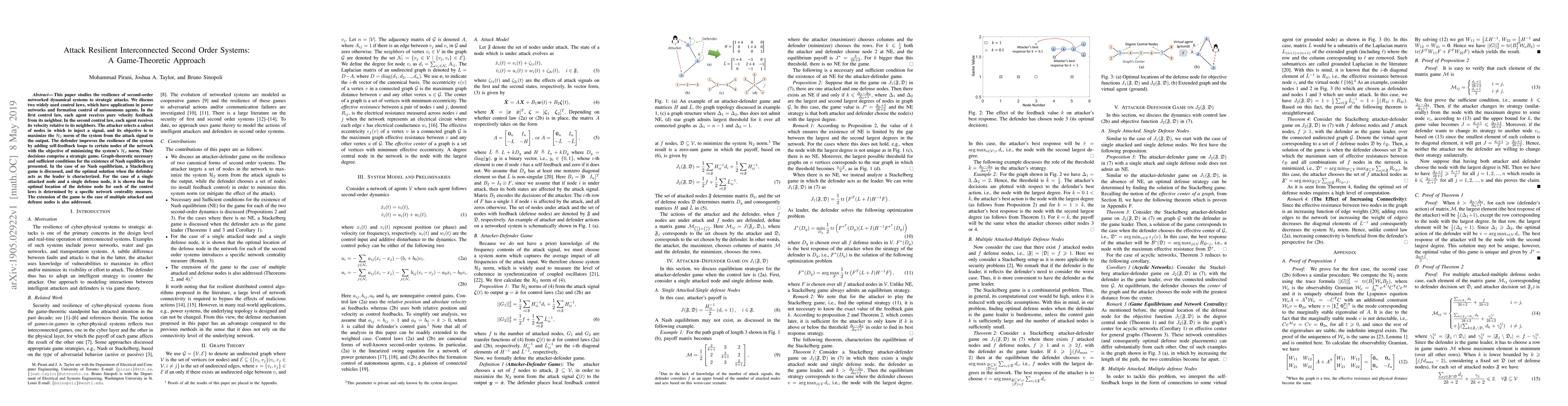 This paper studies the resilience of second-order networked dynamical systems to strategic attacks. We discuss two widely used control laws, which have applications in power networks and formation control of autonomous agents. In the first control law, each agent receives pure velocity feedback from its neighbor. In the second control law, each agent receives its velocity relative to its neighbors. The attacker selects a subset of nodes in which to inject a signal, and its objective is to maximize the $\mathcal{H}_2$ norm of the system from the attack signal to the output. The defender improves the resilience of the system by adding self-feedback loops to certain nodes of the network with the objective of minimizing the system's $\mathcal{H}_2$ norm. Their decisions comprise a strategic game. Graph-theoretic necessary and sufficient conditions for the existence of Nash equilibria are presented. In the case of no Nash equilibrium, a Stackelberg game is discussed, and the optimal solution when the defender acts as the leader is characterized. For the case of a single attacked node and a single defense node, it is shown that the optimal location of the defense node for each of the control laws is determined by a specific network centrality measure. The extension of the game to the case of multiple attacked and defense nodes is also addressed.