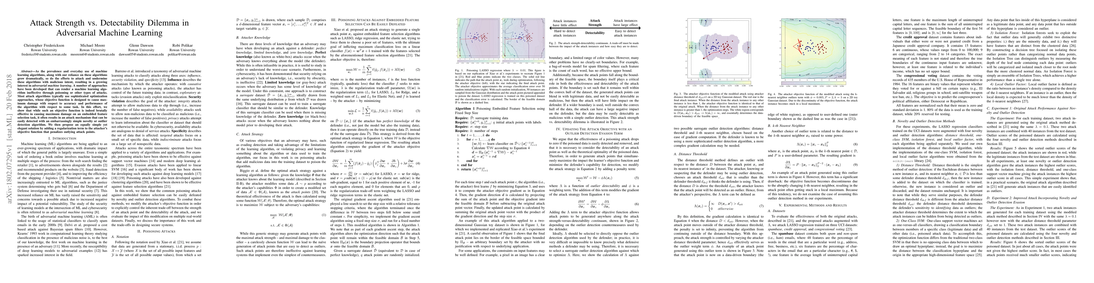 As the prevalence and everyday use of machine learning algorithms, along with our reliance on these algorithms grow dramatically, so do the efforts to attack and undermine these algorithms with malicious intent, resulting in a growing interest in adversarial machine learning. A number of approaches have been developed that can render a machine learning algorithm ineffective through poisoning or other types of attacks. Most attack algorithms typically use sophisticated optimization approaches, whose objective function is designed to cause maximum damage with respect to accuracy and performance of the algorithm with respect to some task. In this effort, we show that while such an objective function is indeed brutally effective in causing maximum damage on an embedded feature selection task, it often results in an attack mechanism that can be easily detected with an embarrassingly simple novelty or outlier detection algorithm. We then propose an equally simple yet elegant solution by adding a regularization term to the attacker's objective function that penalizes outlying attack points.