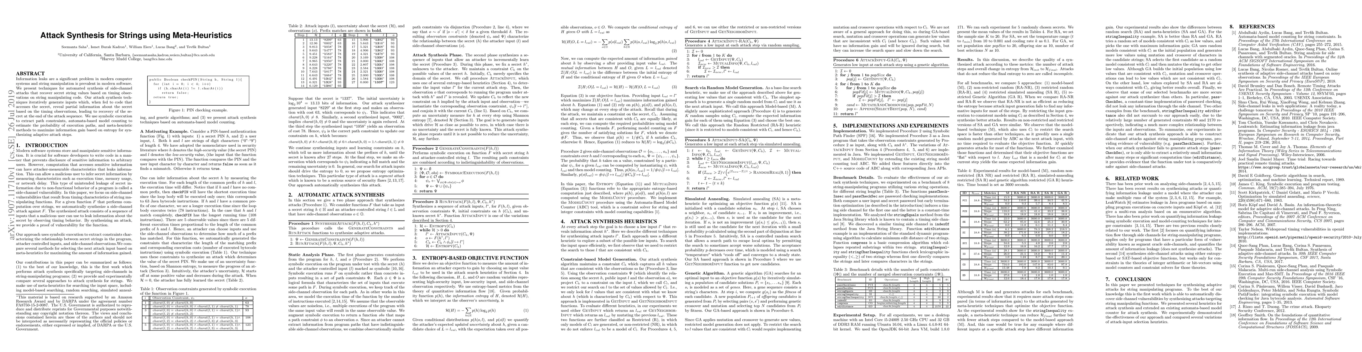 This paper presents automated techniques for synthesizing side-channel attacks on string manipulation code by leveraging timing observations. It employs symbolic execution, model counting, and meta-heuristics to iteratively generate inputs that reveal partial information about the secret string, ultimately recovering it through adaptive attack steps.