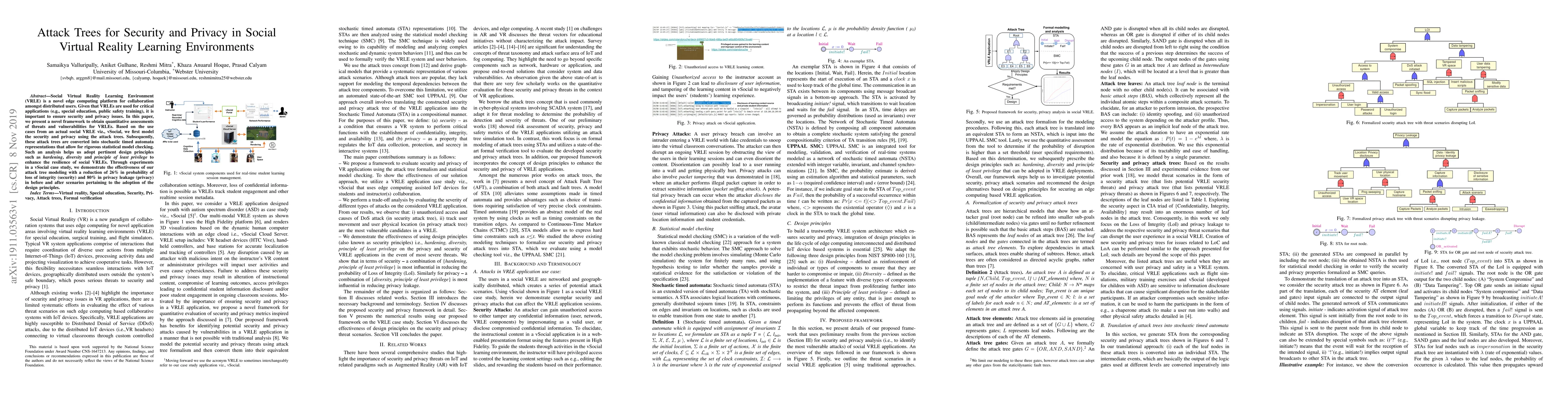 Social Virtual Reality Learning Environment (VRLE) is a novel edge computing platform for collaboration amongst distributed users. Given that VRLEs are used for critical applications (e.g., special education, public safety training), it is important to ensure security and privacy issues. In this paper, we present a novel framework to obtain quantitative assessments of threats and vulnerabilities for VRLEs. Based on the use cases from an actual social VRLE viz., vSocial, we first model the security and privacy using the attack trees. Subsequently, these attack trees are converted into stochastic timed automata representations that allow for rigorous statistical model checking. Such an analysis helps us adopt pertinent design principles such as hardening, diversity and principle of least privilege to enhance the resilience of social VRLEs. Through experiments in a vSocial case study, we demonstrate the effectiveness of our attack tree modeling with a reduction of 26% in probability of loss of integrity (security) and 80% in privacy leakage (privacy) in before and after scenarios pertaining to the adoption of the design principles.