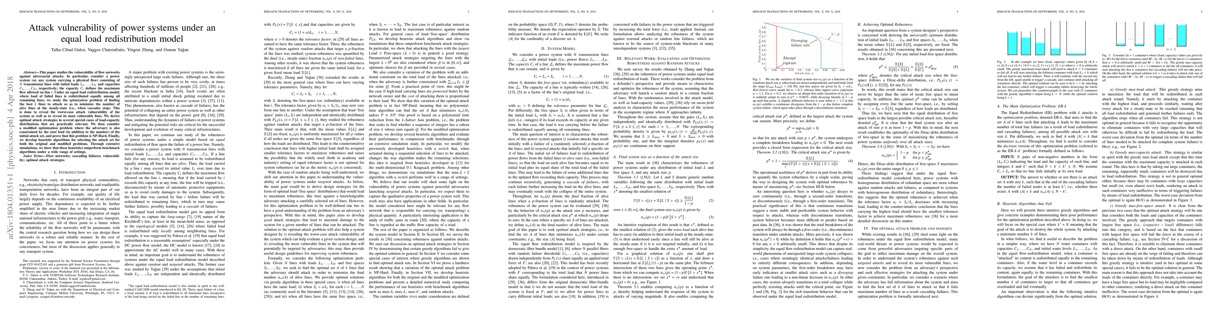 Researchers study power system vulnerability to attacks by analyzing how it responds to equal load redistribution under different attack scenarios, revealing optimal strategies to minimize the number of operational lines.