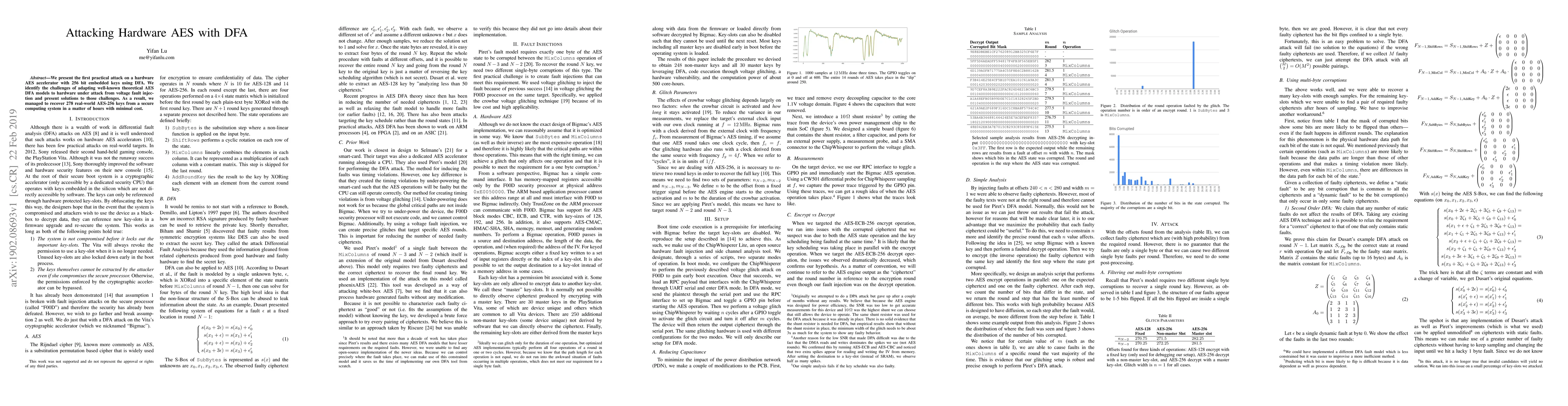 This paper details a practical differential fault analysis (DFA) attack on a hardware AES accelerator, successfully recovering 278 AES-256 keys despite challenges from voltage fault injection, demonstrating the vulnerability of secure computing systems.