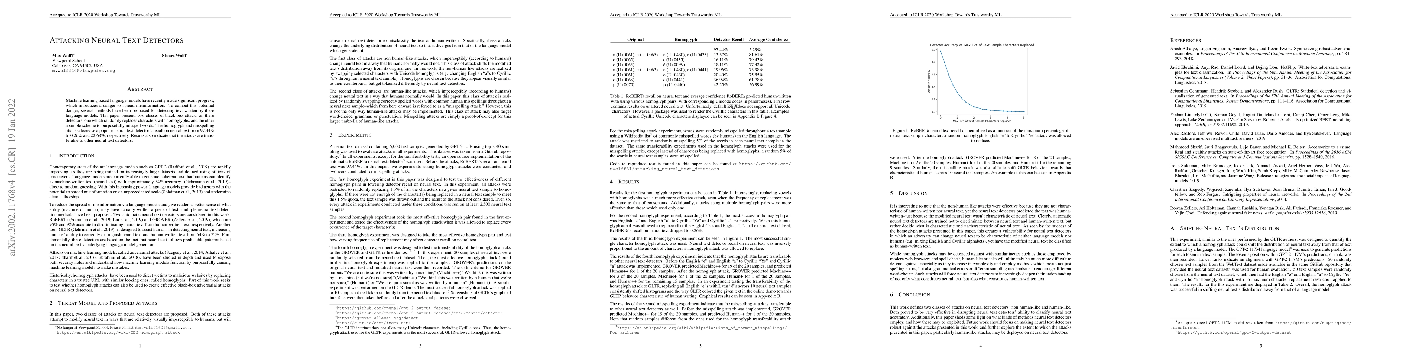 This paper explores black-box attacks on neural text detectors designed to identify text generated by machine learning models, revealing two effective methods: homoglyph character substitution and purposeful word misspellings. These attacks significantly reduce detection accuracy and show transferability across different detectors.