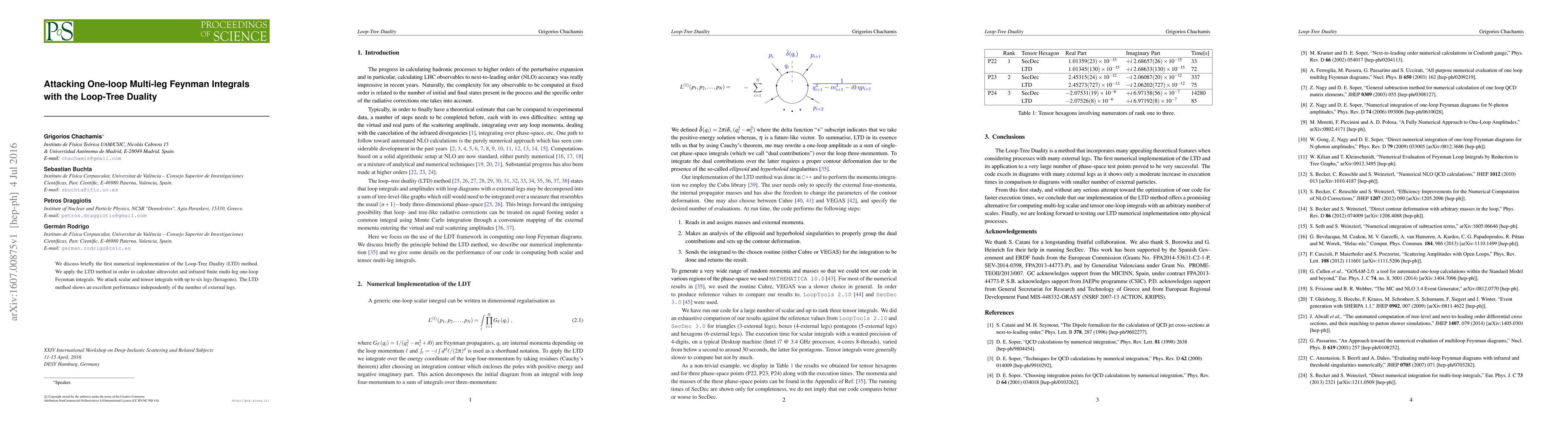 We discuss briefly the first numerical implementation of the Loop-Tree Duality (LTD) method. We apply the LTD method in order to calculate ultraviolet and infrared finite multi-leg one-loop Feynman integrals. We attack scalar and tensor integrals with up to six legs (hexagons). The LTD method shows an excellent performance independently of the number of external legs.