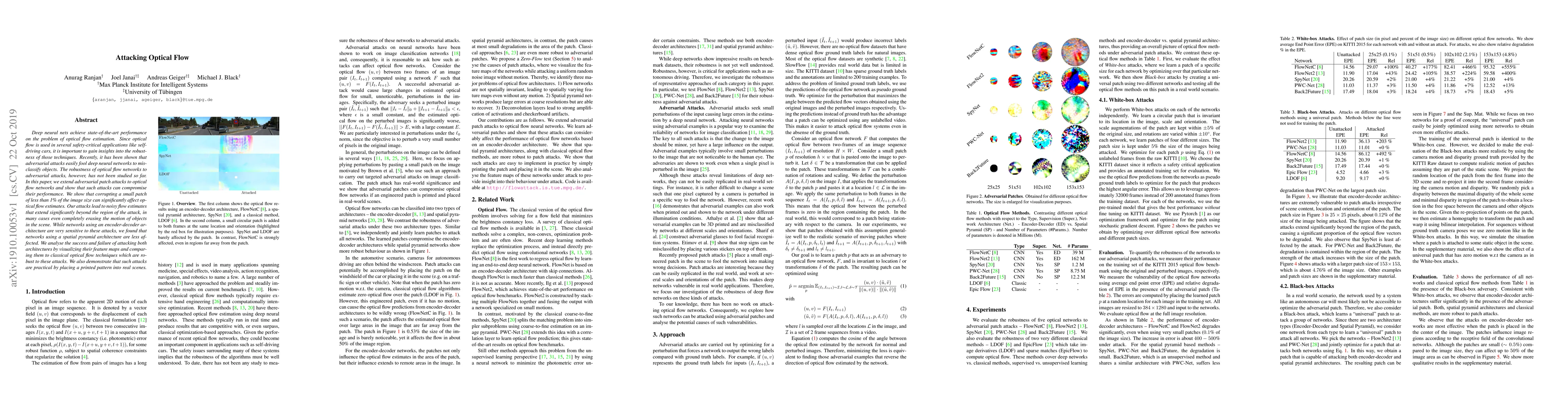 Deep neural nets achieve state-of-the-art performance on the problem of optical flow estimation. Since optical flow is used in several safety-critical applications like self-driving cars, it is important to gain insights into the robustness of those techniques. Recently, it has been shown that adversarial attacks easily fool deep neural networks to misclassify objects. The robustness of optical flow networks to adversarial attacks, however, has not been studied so far. In this paper, we extend adversarial patch attacks to optical flow networks and show that such attacks can compromise their performance. We show that corrupting a small patch of less than 1% of the image size can significantly affect optical flow estimates. Our attacks lead to noisy flow estimates that extend significantly beyond the region of the attack, in many cases even completely erasing the motion of objects in the scene. While networks using an encoder-decoder architecture are very sensitive to these attacks, we found that networks using a spatial pyramid architecture are less affected. We analyse the success and failure of attacking both architectures by visualizing their feature maps and comparing them to classical optical flow techniques which are robust to these attacks. We also demonstrate that such attacks are practical by placing a printed pattern into real scenes.