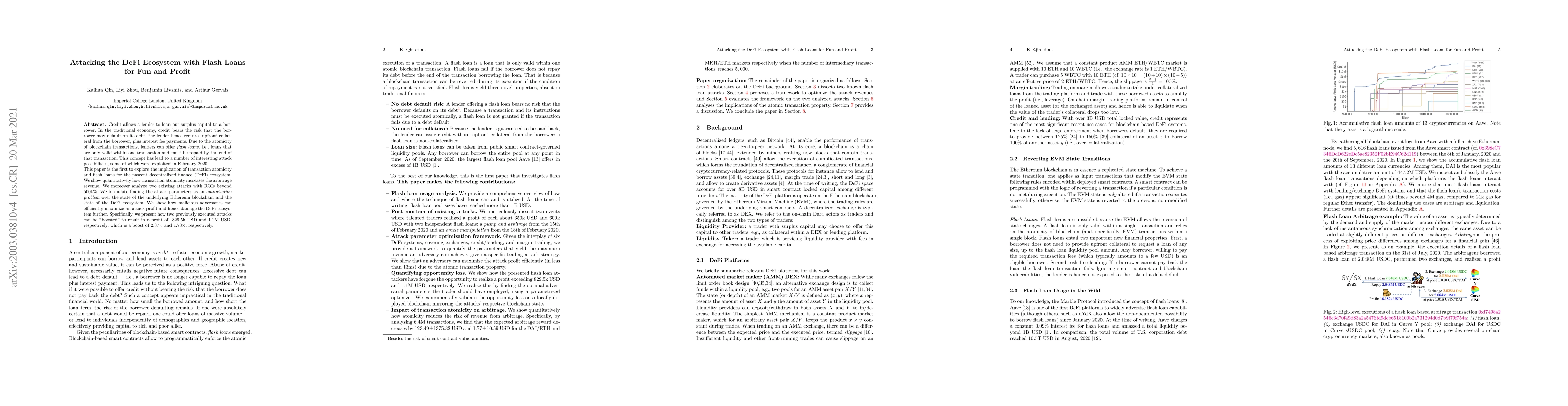 Credit allows a lender to loan out surplus capital to a borrower. In the traditional economy, credit bears the risk that the borrower may default on its debt, the lender hence requires upfront collateral from the borrower, plus interest fee payments. Due to the atomicity of blockchain transactions, lenders can offer flash loans, i.e., loans that are only valid within one transaction and must be repaid by the end of that transaction. This concept has lead to a number of interesting attack possibilities, some of which were exploited in February 2020. This paper is the first to explore the implication of transaction atomicity and flash loans for the nascent decentralized finance (DeFi) ecosystem. We show quantitatively how transaction atomicity increases the arbitrage revenue. We moreover analyze two existing attacks with ROIs beyond 500k%. We formulate finding the attack parameters as an optimization problem over the state of the underlying Ethereum blockchain and the state of the DeFi ecosystem. We show how malicious adversaries can efficiently maximize an attack profit and hence damage the DeFi ecosystem further. Specifically, we present how two previously executed attacks can be "boosted" to result in a profit of 829.5k USD and 1.1M USD, respectively, which is a boost of 2.37x and 1.73x, respectively.