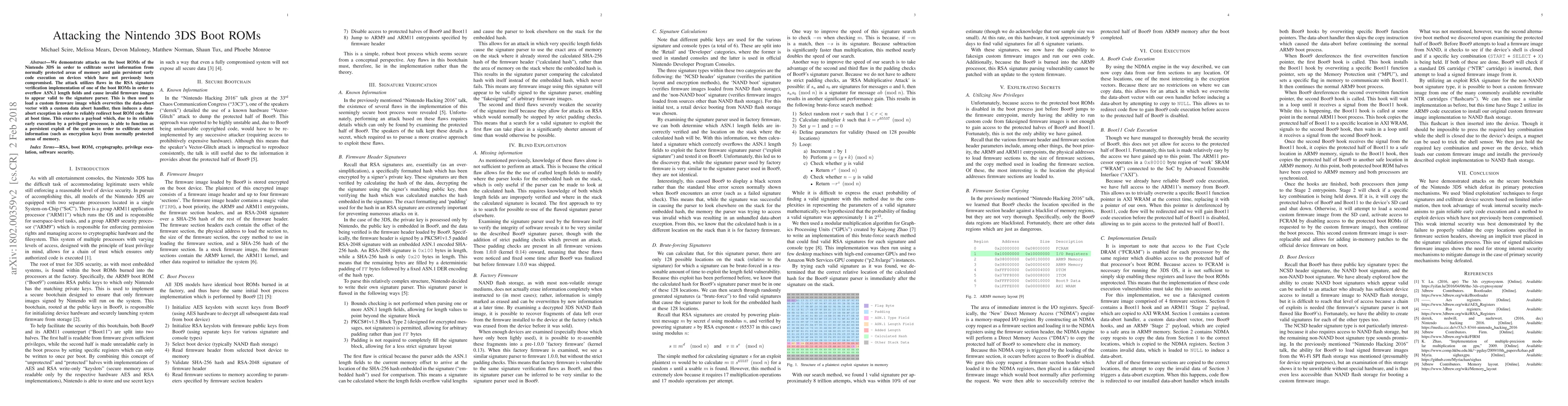 We demonstrate attacks on the boot ROMs of the Nintendo 3DS in order to exfiltrate secret information from normally protected areas of memory and gain persistent early code execution on devices which have not previously been compromised. The attack utilizes flaws in the RSA signature verification implementation of one of the boot ROMs in order to overflow ASN.1 length fields and cause invalid firmware images to appear valid to the signature parser. This is then used to load a custom firmware image which overwrites the data-abort vector with a custom data abort handler, then induces a data-abort exception in order to reliably redirect boot ROM code flow at boot time. This executes a payload which, due to its reliable early execution by a privileged processor, is able to function as a persistent exploit of the system in order to exfiltrate secret information (such as encryption keys) from normally protected areas of memory.